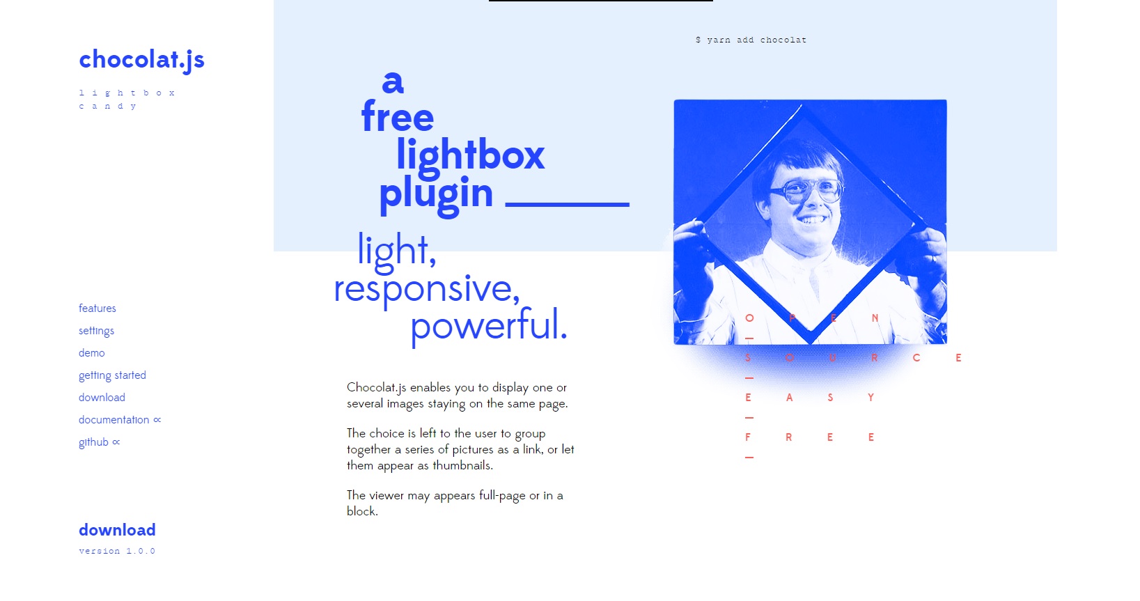 chocolat.js는 웹사이트의 대문을 풀커버 or 컨테이너 내부의 이미지로 제작할 때 사용할 수 있는 자바스크립트 라이브러리다. 사실 풀커버 이미지 정도는 부트스트랩, 파운데이션, 머트리얼과 같은 css프레임워크로도 충분히 제작할 수 있으며, 굳이 chocolat.js를 사용할 필요가 없다. 그럼에도 불구하고 chocolat.js를 한번쯤 눈여겨 볼 필요가 있는 이유는 사용자가 이미지 크기를 조작할 수 있기 때문이다.