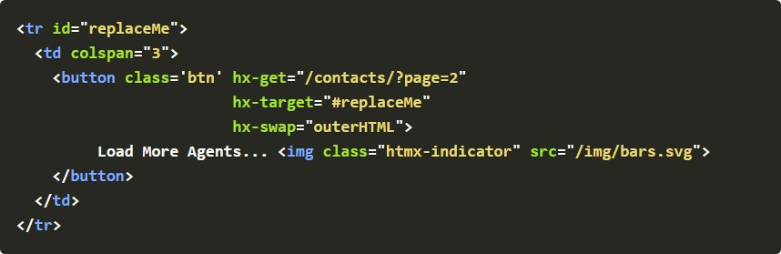 htmx를 사용하는 이유는 가상DOM에 있다. htmx는 데이터 바인딩 기능과 함께 서버의 데이터를 주고 받을 수 있는 ajax를 덧붙였다. 아래 테이블 관련 예제코드는 htmx의 확실한 방향을 보여준다.