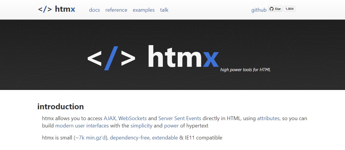 htmx high power tools for HTML introduction htmx allows you to access AJAX, WebSockets and Server Sent Events directly in HTML, using attributes, so you can build modern user interfaces with the simplicity and power of hypertext htmx is small (~7k min.gz'd