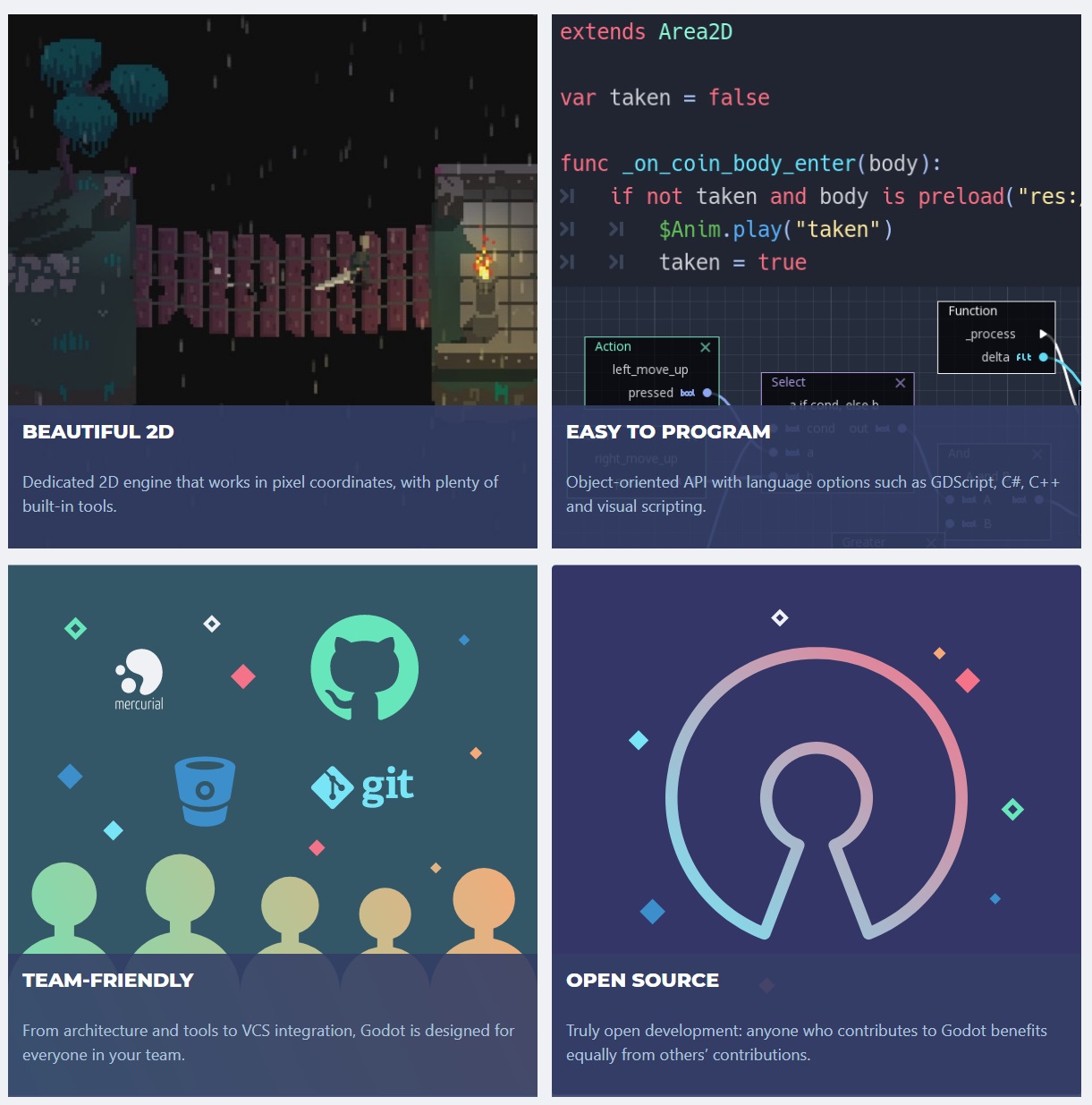 godotEngine4.0부터는 3D랜더링(Vulkan기반), 실시간 GI, 기타 등 3D기능을 지원하기 때문에 유니티, 언리얼과 같은 게임엔진과 별 다른 차이점이 없다. 하지만 무게감으로 따지면 godotEngine을 따라올 수 있는 게임엔진은 아직까지 없을 듯하다. 후원을 바탕으로 개발된 것과 100%오픈소스라는 점이 다소 특이하지만 godotEngine의 가장 큰 희소가치는 속도에 있다. 전체 파일 크기는 60mb정도 되며, 불필요한 기능과 그래픽적 효과는 찾아볼 수 없다.