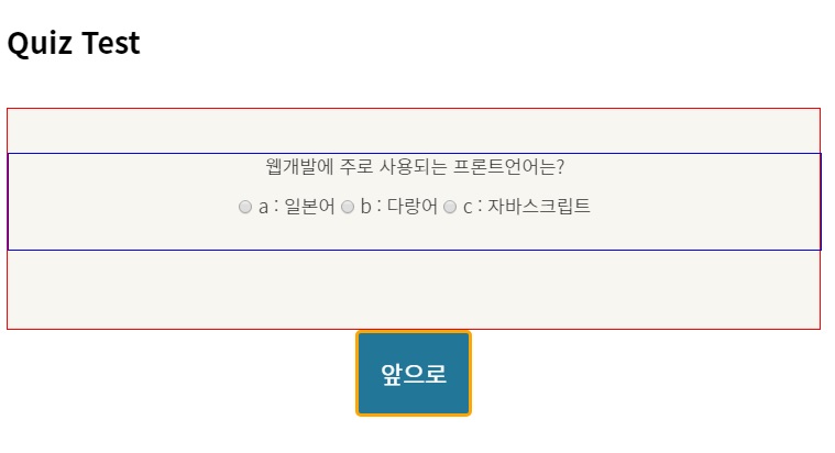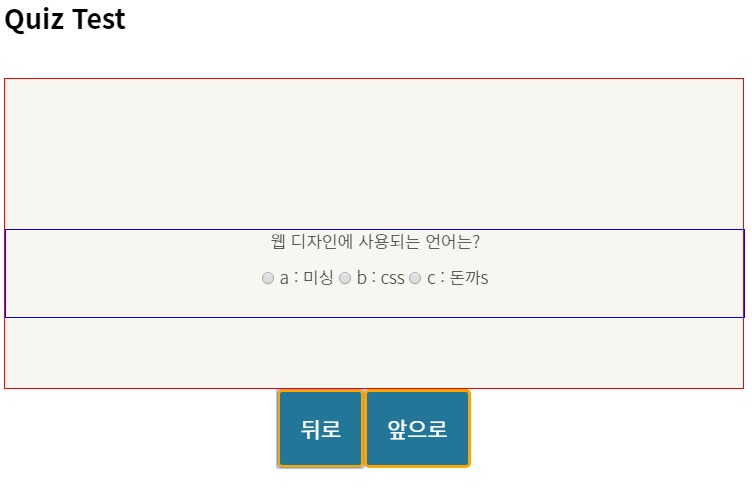기존의 코드에서 'quiz-container'클래스의 <div>태그와 <button>태그 3개를 동시에 컨트롤 할 수 있는 quiz-ctrl 클래스를 추가했다. 여기서 핵심은 퀴즈 문제가 표시되는 영역을 container로 묶은 것에 있다. 앞,뒤 버튼을 클릭할 때마다 quiz-container영역의 퀴즈 문제와 선택지는 변경되며, quiz-ctrl, result영역은 유지되어야 하기 때문에 quiz-container와 quiz-ctrl을 분리해줘야 한다.