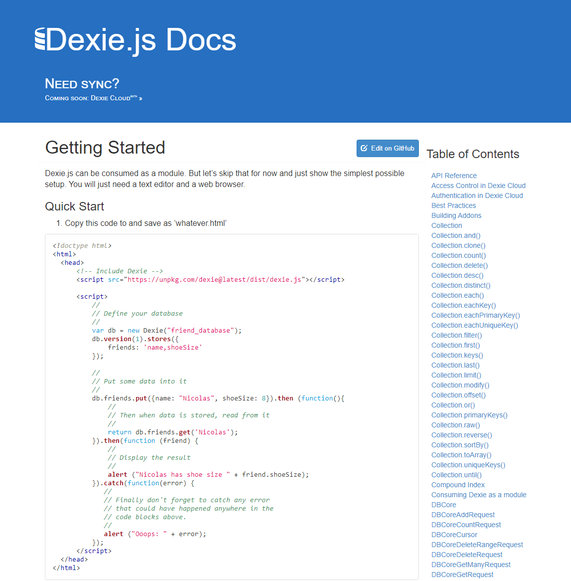 Dexie.js can be consumed as a module. But let’s skip that for now and just show the simplest possible setup. You will just need a text editor and a web browser. Quick Start Copy this code to and save as ‘whatever.html’ // // Define your database // v