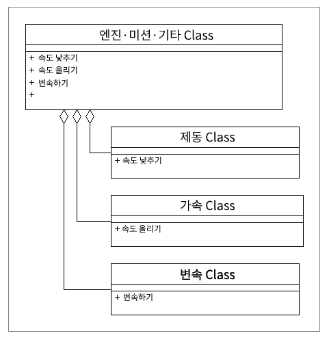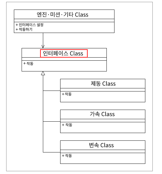 덕분에 운전자, 엔진이 변경되더라도 인터페이스는 그대로 유지될 수 있다.(외부변화에 무관)