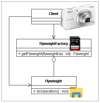 *사용빈도 : ★★★★☆ *추천 : ★★★★☆ *특징 : 데이터 시각화에 유리함 플라이웨이트 패턴은 디지털카메라와 비슷하다. 필름카메라와 디지털카메라의 가장 큰 차이점이 무엇일까? 필름카메라를 다이어그램으로 표현하면 대략 아래와 같다. ![]() 필름카메라에서 이미지 양을 늘릴수록 필름의 양도 늘어난다. 만일, 1000장을 촬영해야 한다면, 필름을 갖고 다니기도 부담스럽다. 그래서 플라이웨이트 패턴이 등장했다. ![]() 플라이웨이트 패턴에서 FlyweightFactory클래스는 가상의 객체(프로토타입) Flyweight를 무한정 생산한다. FlyweightFactory인터페이스 클래스는 추상화 객체이므로 사진의 양에 크게 제한받지 않는다. ![]() 플라이웨이트 패턴으로 카메라 설계를 한다면, 위와같이 디지털카메라가 탄생하게 된다. |