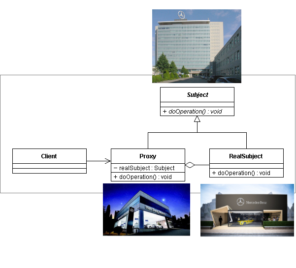 *사용빈도 : ★★★★★ *추천 : ★★★★☆ *특징 : 사용처 다수 프록시 패턴은 대리인이다. 웹서버 관련 용어로 프록시 서버를 접하는 경우가 많은데, 프록시 서버가 바로 프록시 패턴이다. ![]() 프록시 다이어그램에서 RealSubject, Proxy는 Subject기능을 상속받는다. 하지만 Proxy는 RealSubject에 의존하며, RealSubject에서 구현한 기능만을 사용할 수 있다. 프록시 패턴을 현실에 적용하면 수입차 매장이 대표적이다. ![]() 국내의 다임러 벤츠차량의 판매기업은 따로 있다. 고객이 구입하는 차량은 벤츠가 맞지만 고객은 중간 유통사를 통해서는 다임러 벤츠 본사의 판매정책에 관한 요구를 할 수 없다. ![]() 왜냐하면, 한국의 벤츠차량 유통사는 프록시 서버이기 때문이다. |