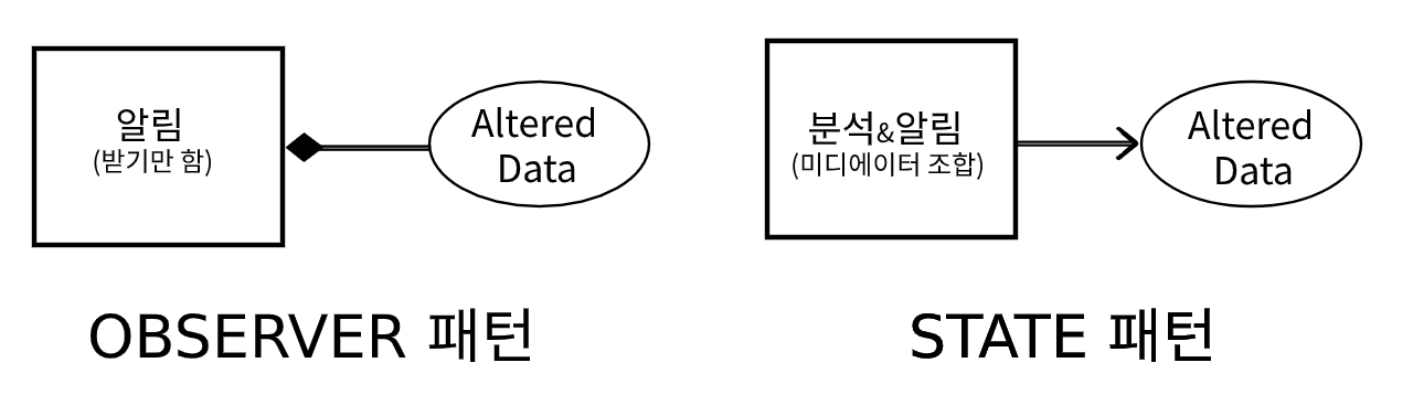 · 실시간으로 변경 상태를 알려주는 패턴이며, State패턴과의 차이점은 중앙처리 알고리즘에 달려 있음 ![]() · State패턴은 특정분야의 같은 업무 내에서 사용하며(분석 가능) |