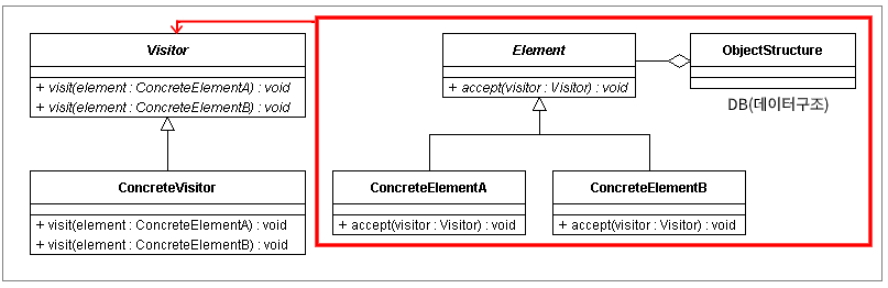 · 객체를 검사하는 데에 용이한 패턴 · 검사대상 객체의 내부에 visit()메서드를 상속하고 해당 메서드의 인자에 검사조건을 담은 Visitor클래스를 전달하는 방식 ![]() |
