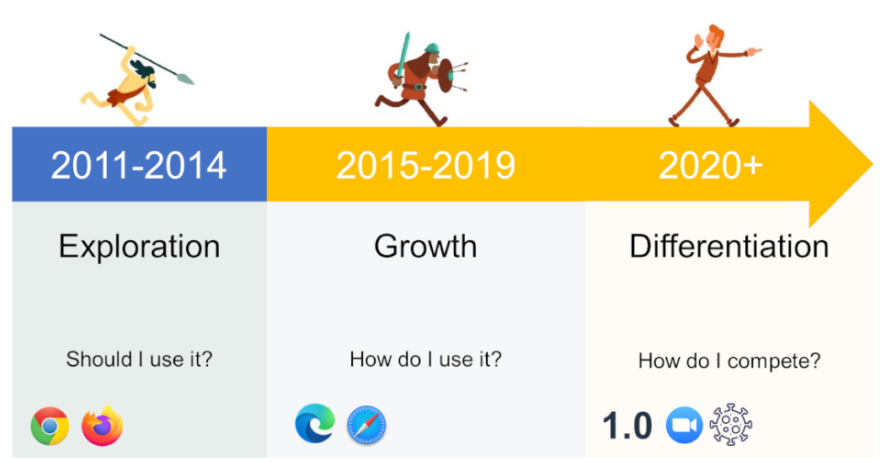 사실상 2019년까지 webRTC는 빙하기였다. 애플, MS가 지원을 어설프게 했기 때문에 구글의 노력만으로 한계가 있었다. 그러나 2020년 코로나 사태가 터지면서 webRTC는 급격히 성장한다. 팬데믹 2년 만에 webRTC는 빠르게 자리잡았고, 이제 '원격', '비대면' 관련 앱에서 필수적으로 사용되고 있다. 위에서 3D씬을 webRTC로 녹화하는 코드가 4년 전에 나왔다는 점을 생각한다면, 상당히 느린 행보였다.