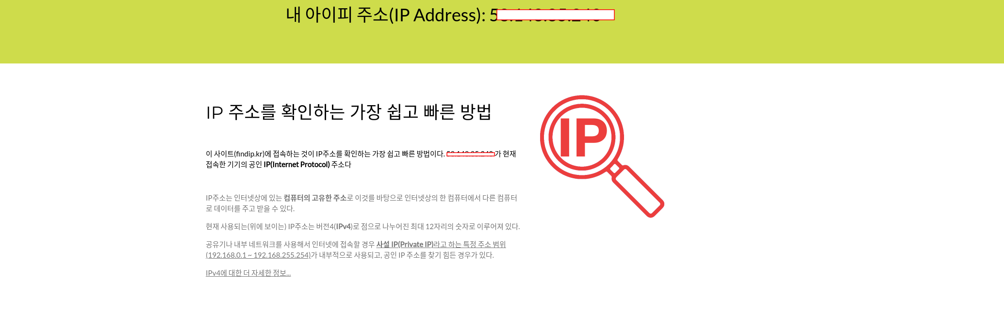 구글에서 '아이피확인'을 검색하면 여러 ip확인 사이트를 볼 수 있다. 아무 곳에나 접속해서 ip를 알아낸다.