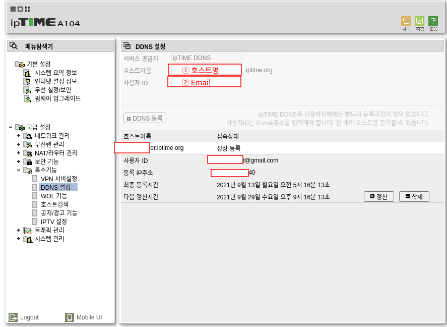 만일, 3000번 포트를 사용한다면 ⑤외부포트, ⑥내부포트 값을 '3000'으로 설정해준다. 그리고 iptime공유기의 경우, ip가 수시로 변경되는 가정용 유동ip에 대응하기 위한 DDNS서비스를 이용할 수 있다. '특수기능 -> DDNS'설정에서 아래와 같이 외부에서 접속할 수 있는 iptime도메인을 설정해보자.