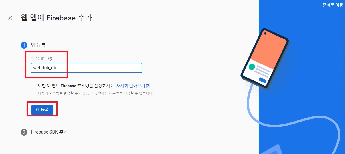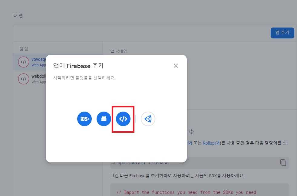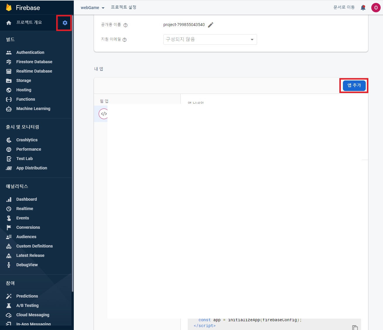 앱 추가 버튼을 클릭한 뒤, 웹 프로젝트를 생성한다.