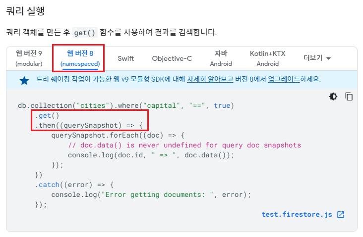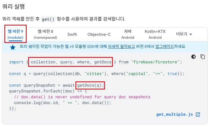 v8과 바뀐 점은 파이어베이스 DOC에서 볼 수 있다. Restful API와 관련된 모듈 사용법은 DOC 웹페이지에서 모두 찾을 수 있다. 파이어베이스로 프로젝트를 진행한다면, 아래 url 즐겨찾기는 필수다.