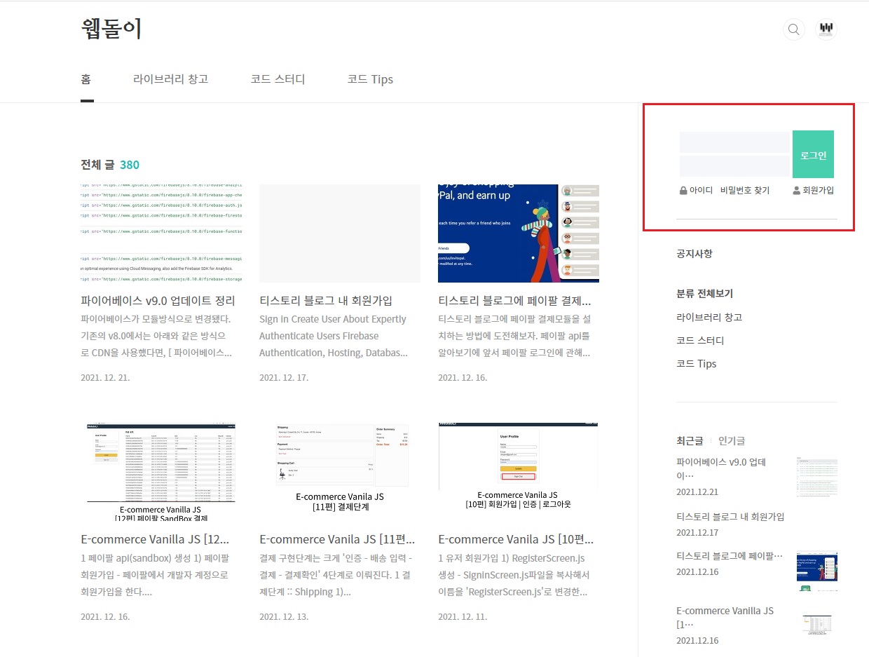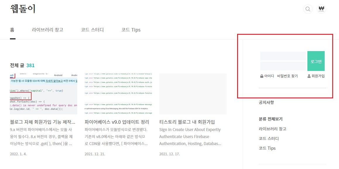 티스토리에서는 블로그만의 자체 로그인 기능을 제공하지 않는다. 파이어베이스 Auth인증을 위해서는 자체적으로 로그인 폼을 제작해야 한다.