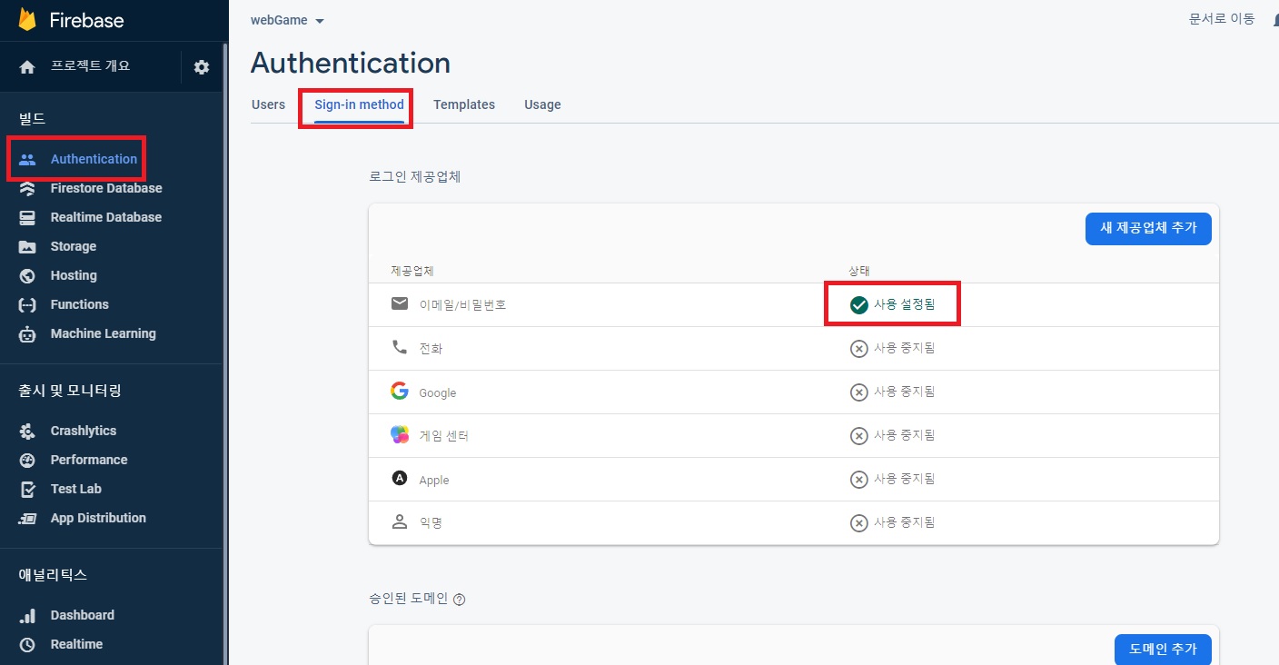 파이어베이스 Auth를 사용하기 위해서는 인증방법을 선택해야 한다. 테스트용으로 인증하기 위해서 이메일 인증을 선택한다.