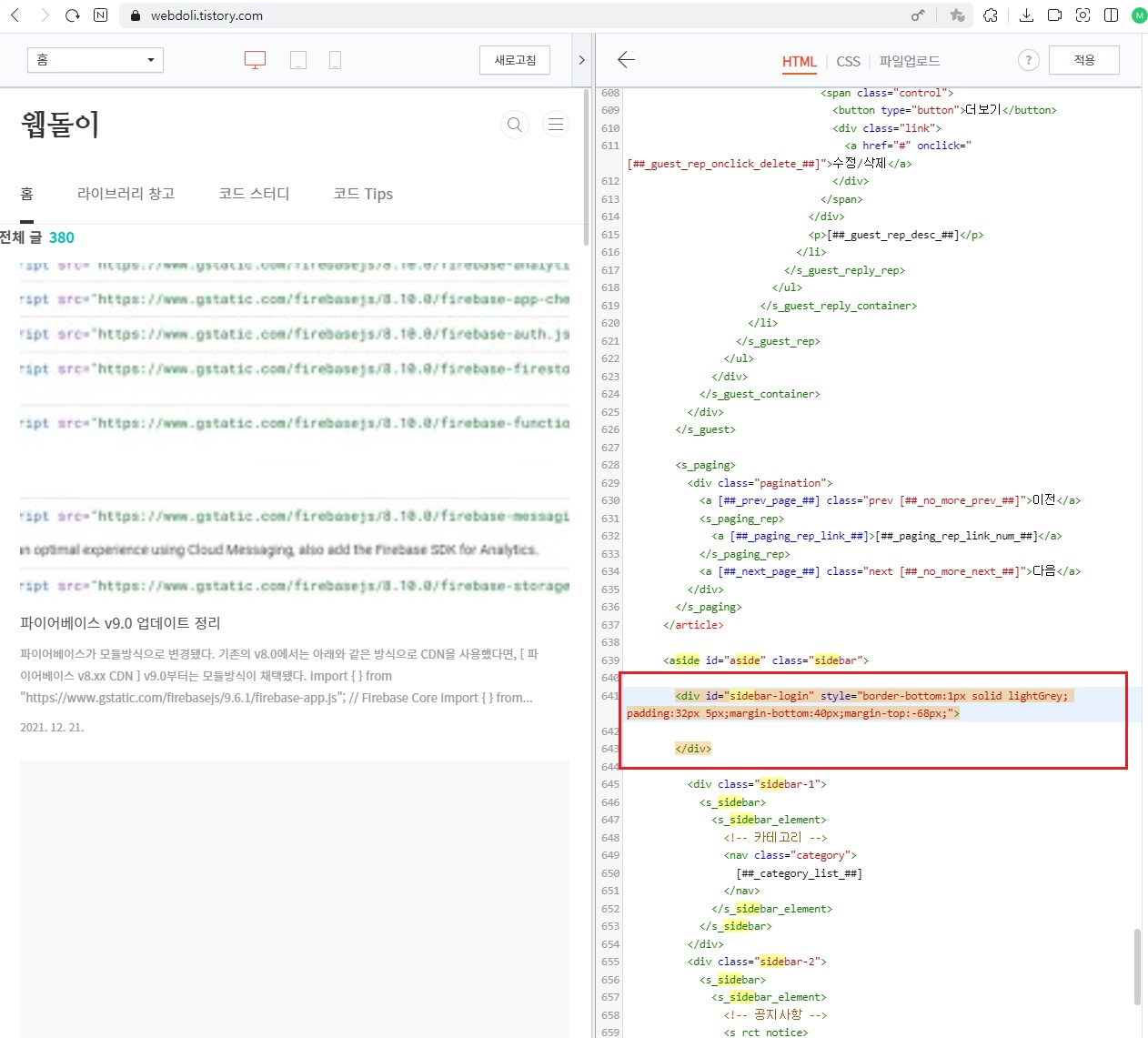 위의 설계에서 '유저 인터페이스' 역할은 로그인 폼이 담당한다. 로그인 폼은 내부의 모듈이 변경되더라도 변하지 않는다. '스킨편집'에서 'id = aside' 아래에 로그인 div태그를 추가해준다.
