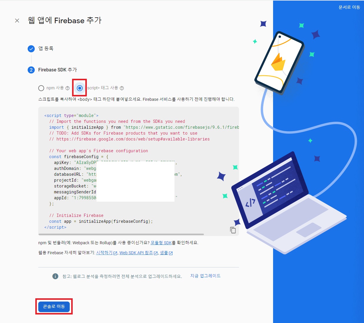 firebaseConfig 키는 메인화면의 설정탭에서 다시 볼 수 있다. 일단, 콘솔로 이동을 클릭하며 마무리한다.