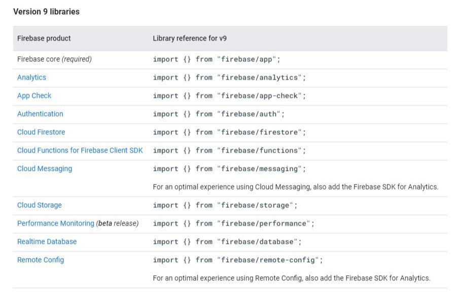 기존의 v8에서는 CDN방식으로 웹에서 파이어베이스 기능을 사용할 수 있었다. 'https://www.gstatic.com/firebasejs/[파이어베이스 버전]/파이어베이스-기능' 형식이며, 현재도 가능하다. CDN방식으로 사용한다면, 아래의 형식에서 버전 부분만 변경하면 된다.