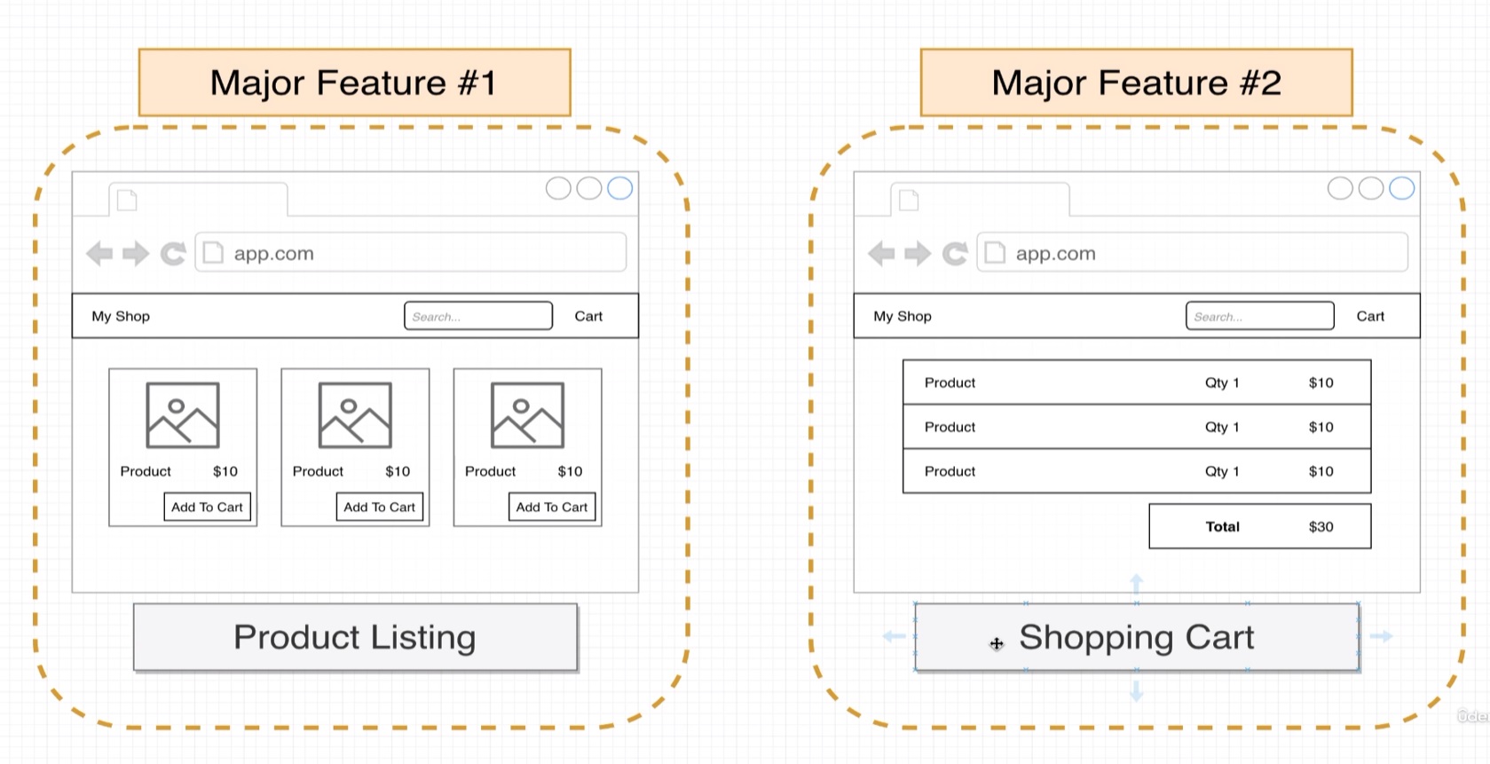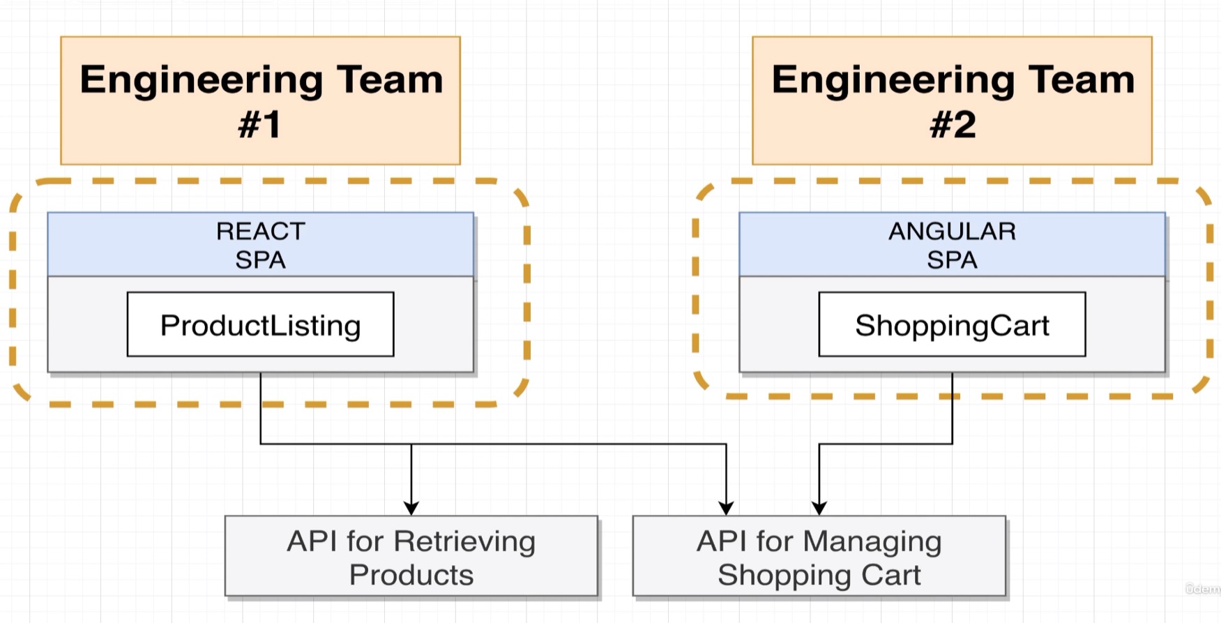 가령, 'Product'개발팀과 'Shopping Cart'개발팀은 (서로 간섭하거나 받지 않고) 독자적으로 개발한다.