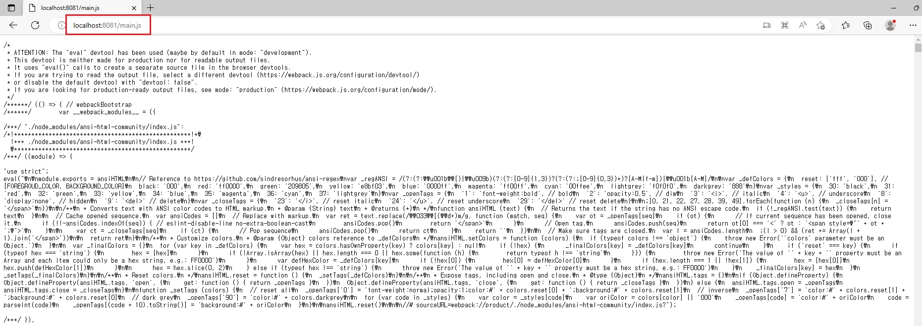 'localhost:8081/main.js' url에서 웹팩이 빌드한 main.js파일을 확인할 수 있다.