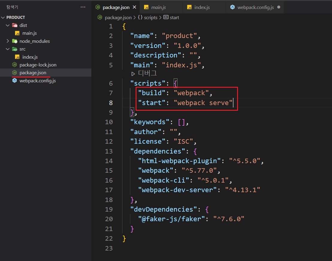 아래와 같이 dist>폴더와 함께 main.js파일이 추가된다. 즉, 웹팩은 프로젝트 내의 모듈을 몽땅 담아서 main.js파일을 생성해준다. webpack server를 실행되면, product/src 폴더의 js파일의 결과가 main.js에 압축되는 셈이다.