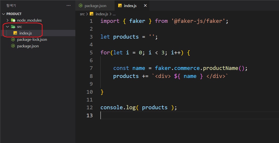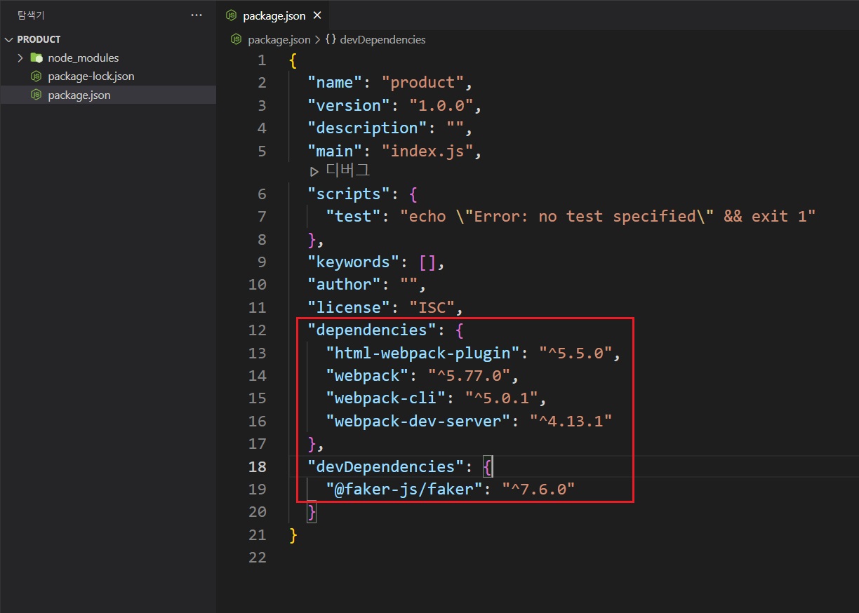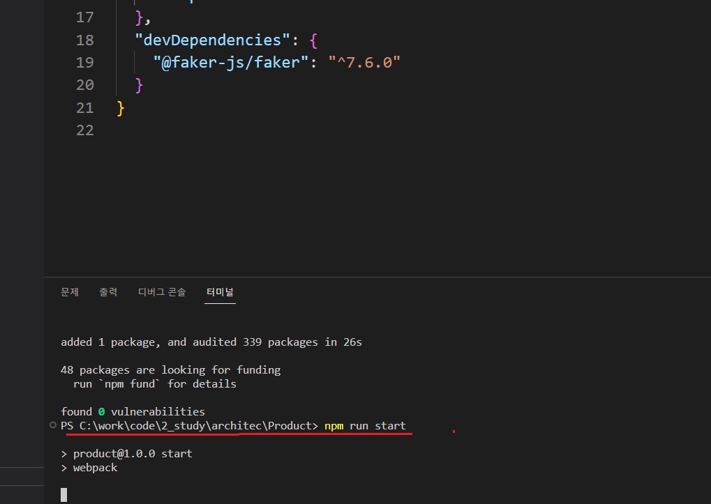 'product'폴더 내(*Ecommerce폴더 아님)에서 위의 웹팩 모듈을 설치했다면, 'nodemon', 'faker'모듈도 추가로 설치한다.