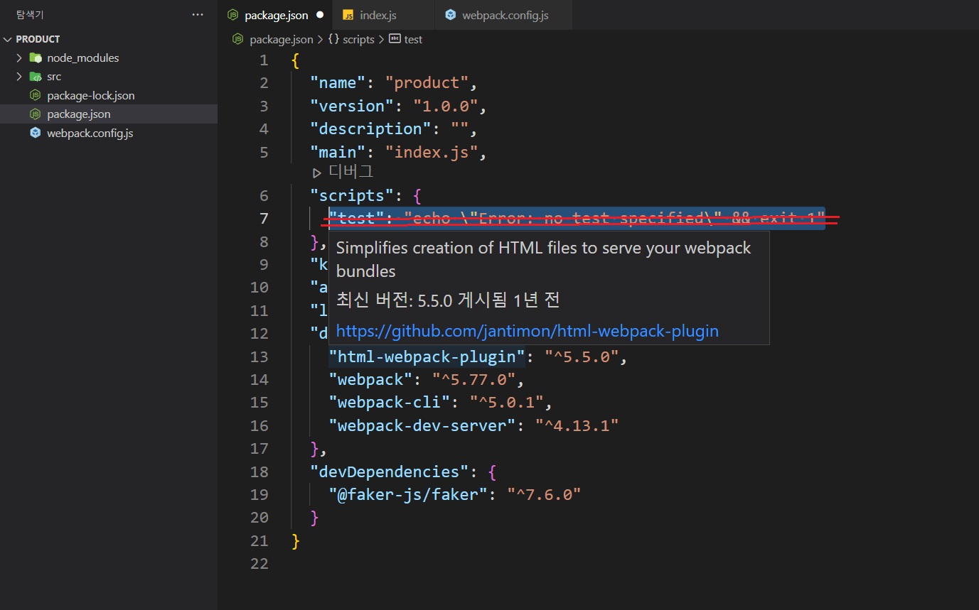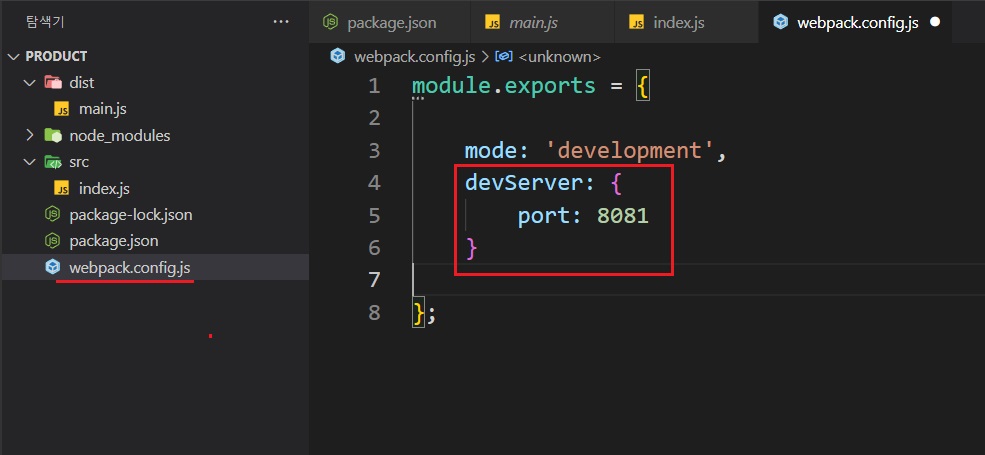 서두에서 설치한 webpack-dev-server모듈을 사용하기 위해서 'webpack.config.js'파일을 product폴더에 생성해준다.