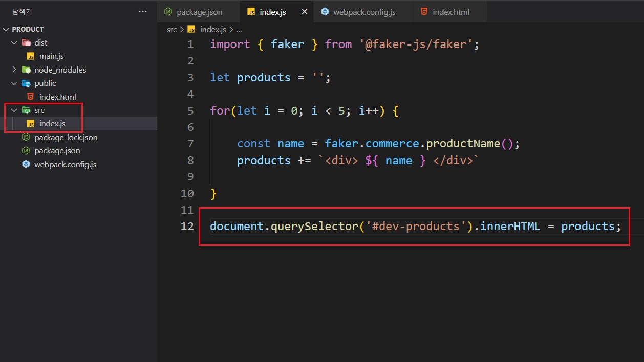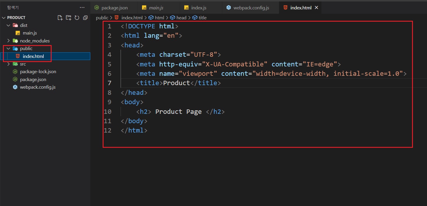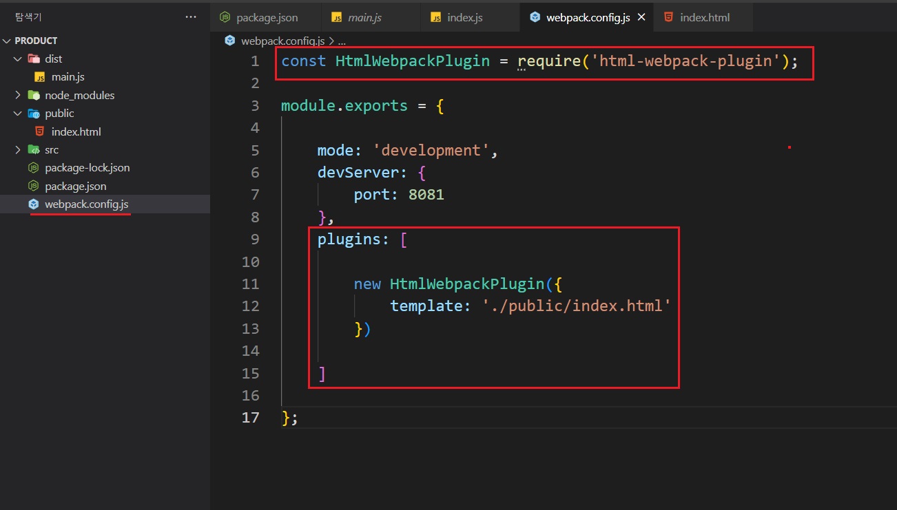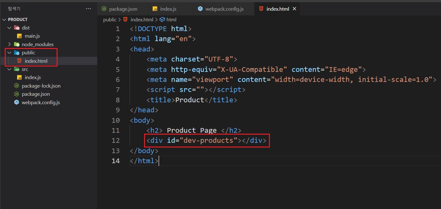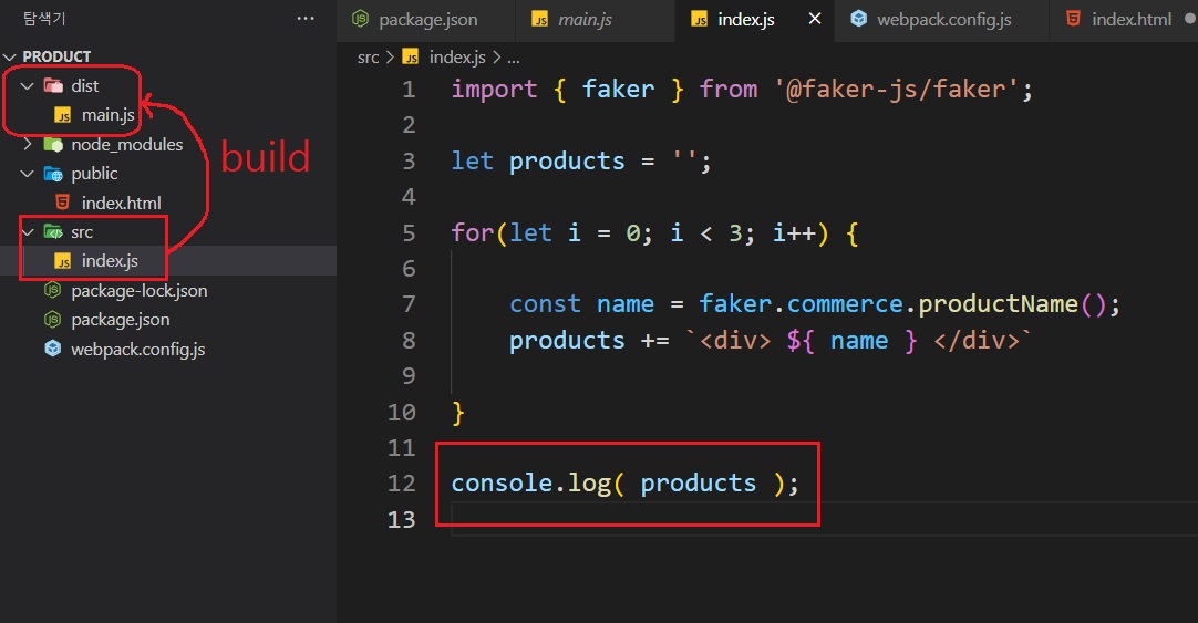 웹팩은 dist폴더에서 생성된 main.js파일을 public/index.html파일에 삽입함으로써 클라이언트는 'product/src'아래에 있는 실행파일을 볼 수 있다.