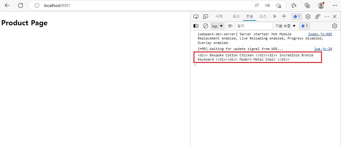 html에서 추가한 'dev-products' id 내부에 faker로 생성된 임의 db를 넣어준다.