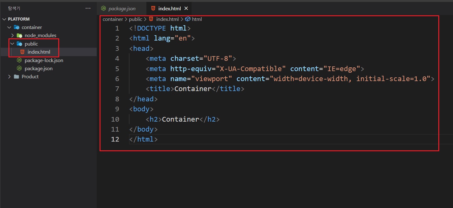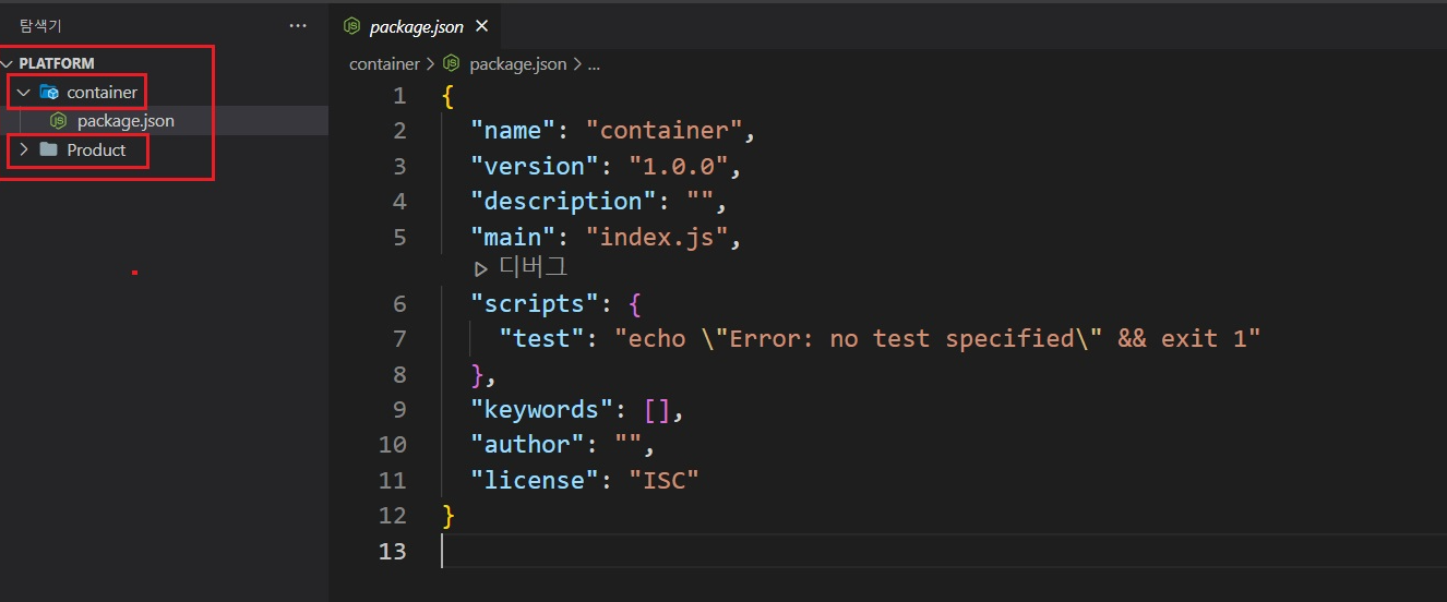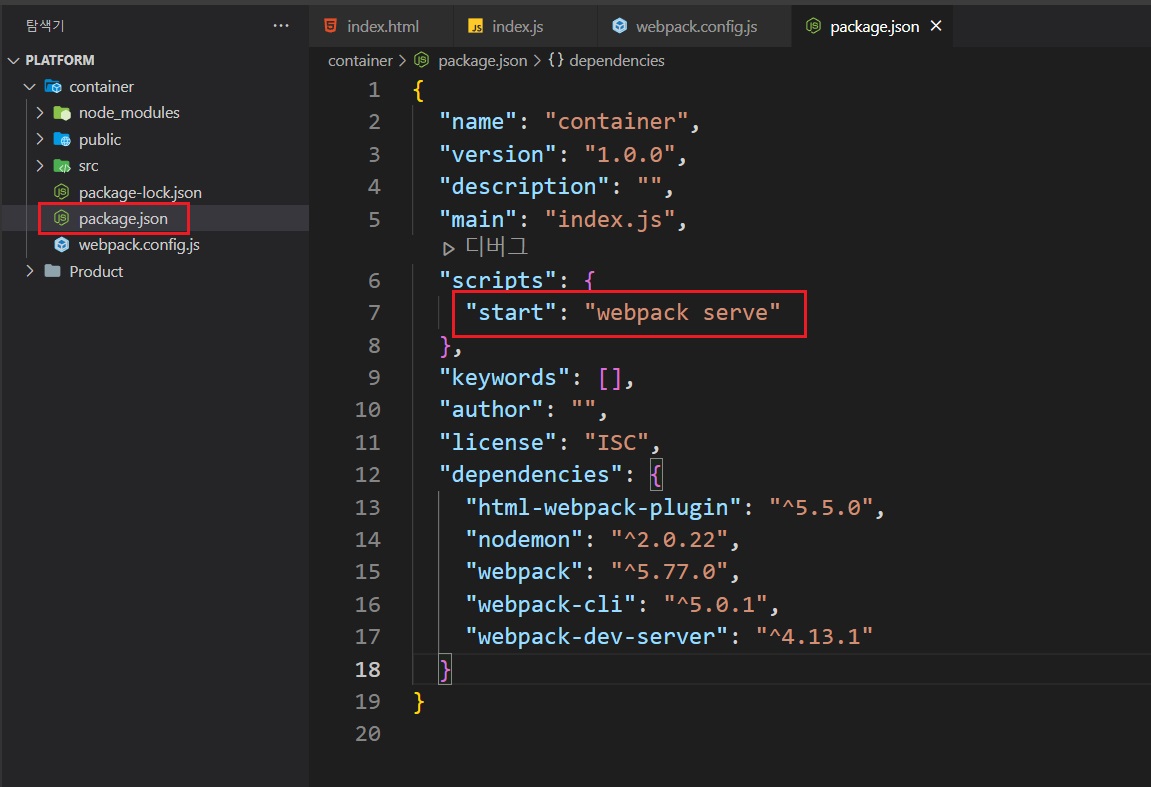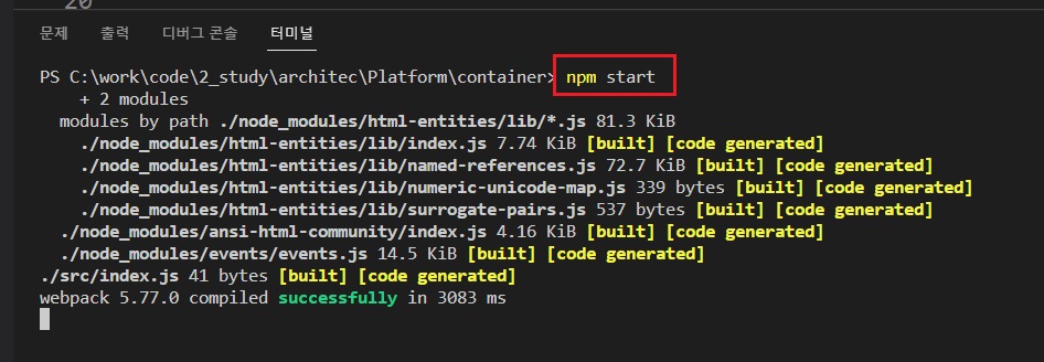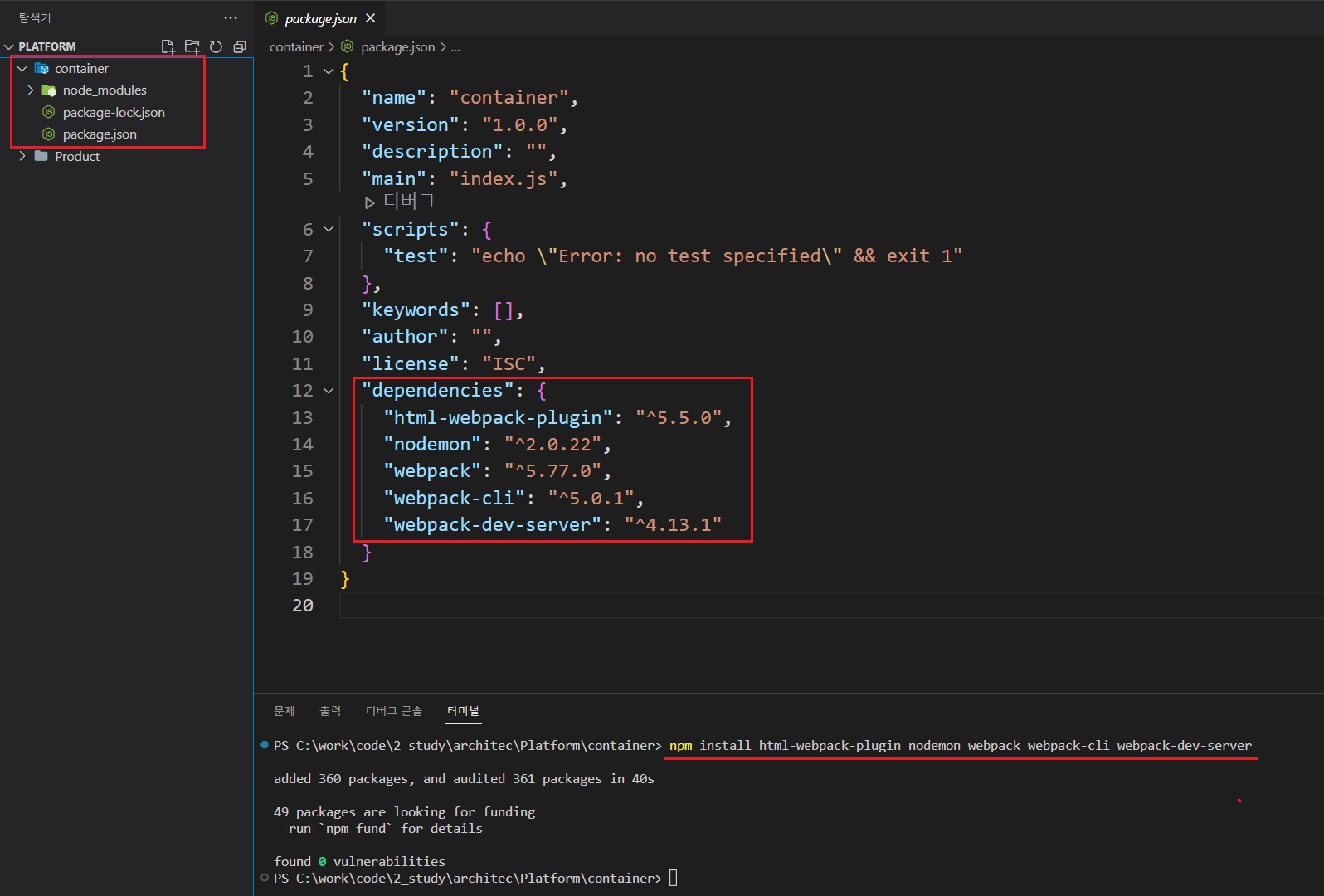 팀장이 주관하는(배포) 메인 폴더, 'container'를 생성한 뒤, 웹팩에 필요한 npm 모듈을 설치한다.