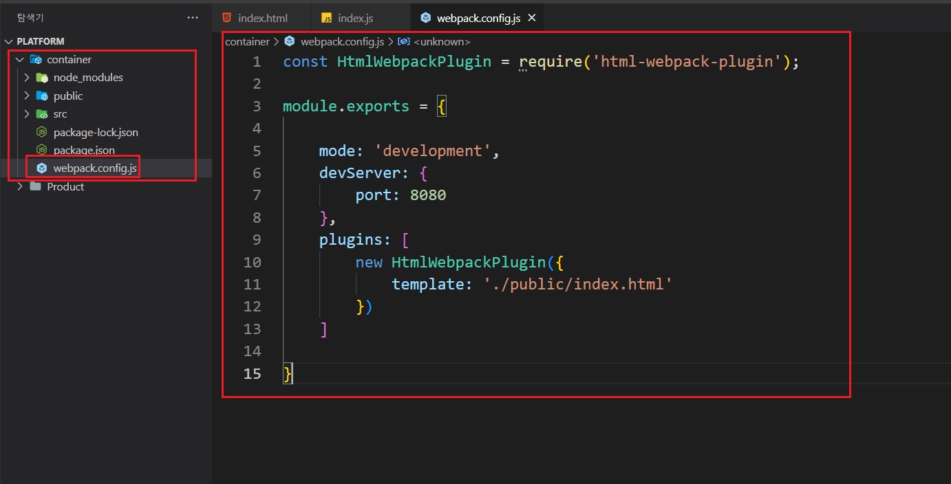 container코드 결과를 볼 수 있는 웹서버를 설정하기 위해 'webpack.config.js'를 생성한다.