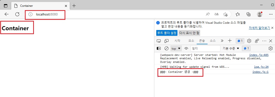 webpack.config.js(container폴더 내)에서 설정한 webpack dev Server의 8080포트는 아래와 같은 결과를 보여준다.