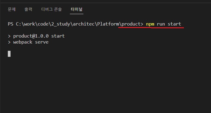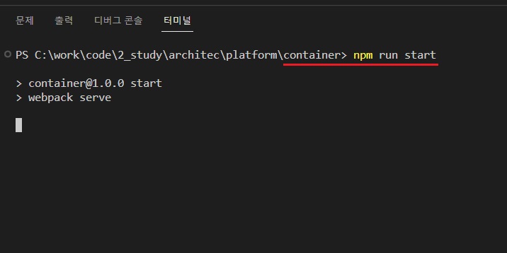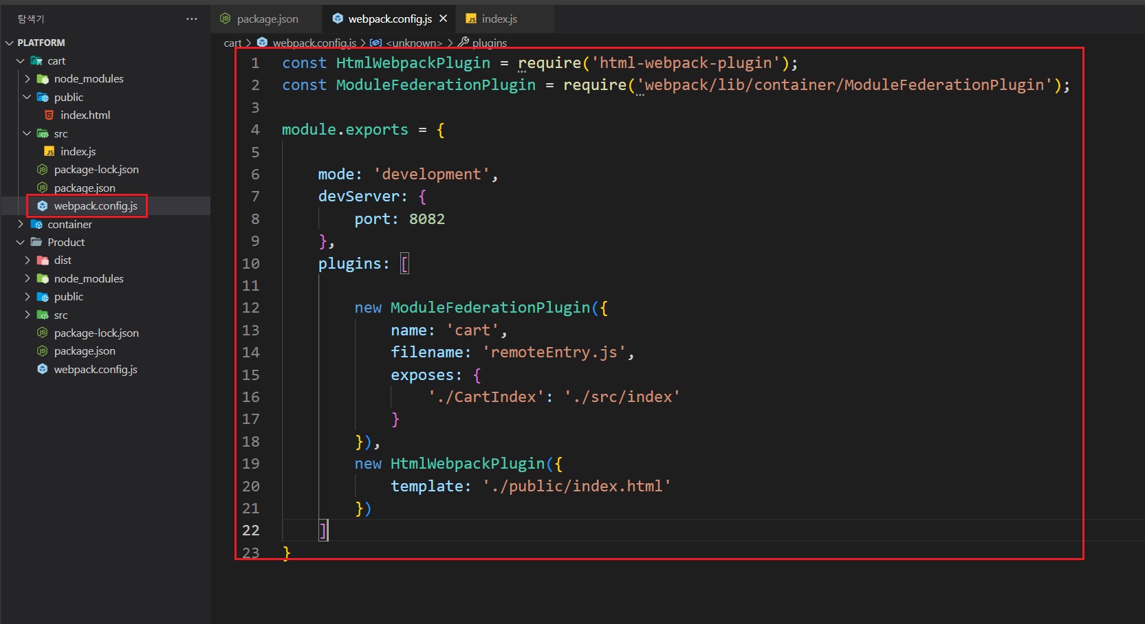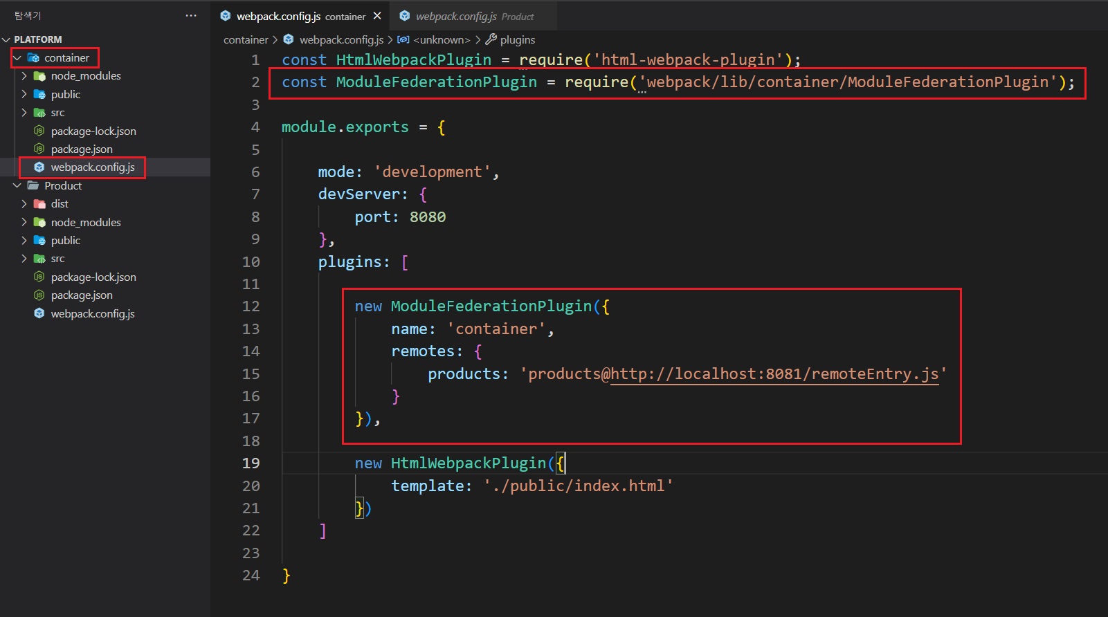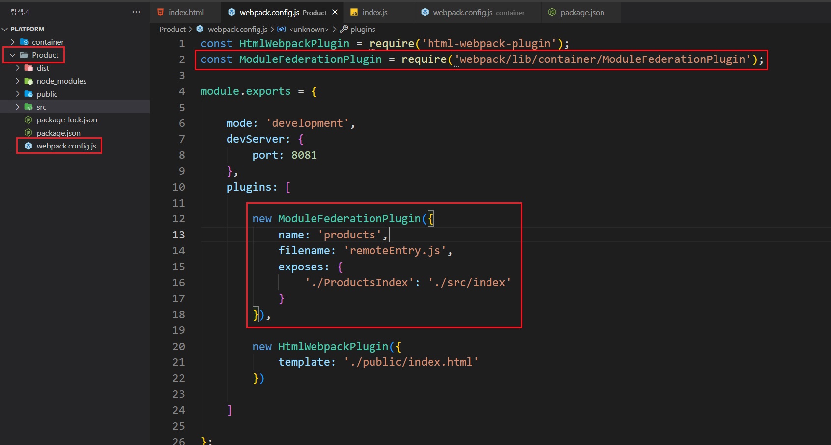 현재 platform폴더 아래에는 container, product폴더가 있으며, container폴더가 배포팀(팀장)이므로 주인이다. 나머지 폴더는 하위 개발팀이므로 각 팀들의 개발코드를 상부에 보고(exposes)해야 한다. 따라서 ModuleFederationPlugin의 exposes값을 위와 같이 설정해줘야 한다.