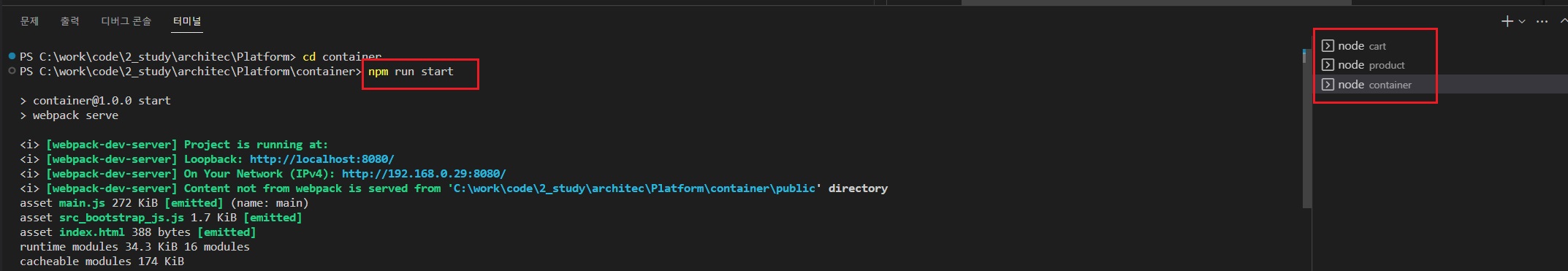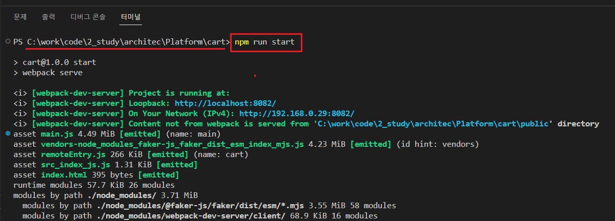 npm run start를 통해 cart의 8082포트가 정상적으로 실행되는지 확인한다.