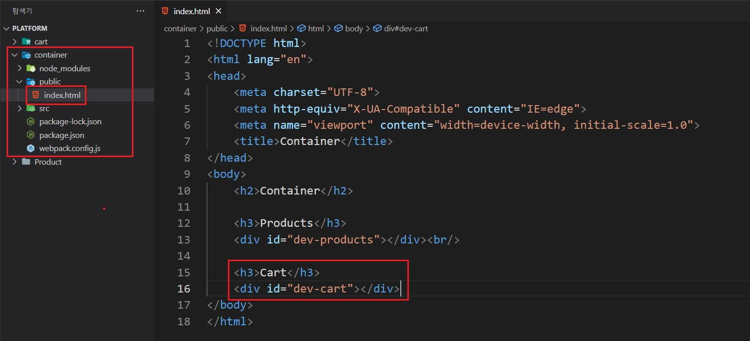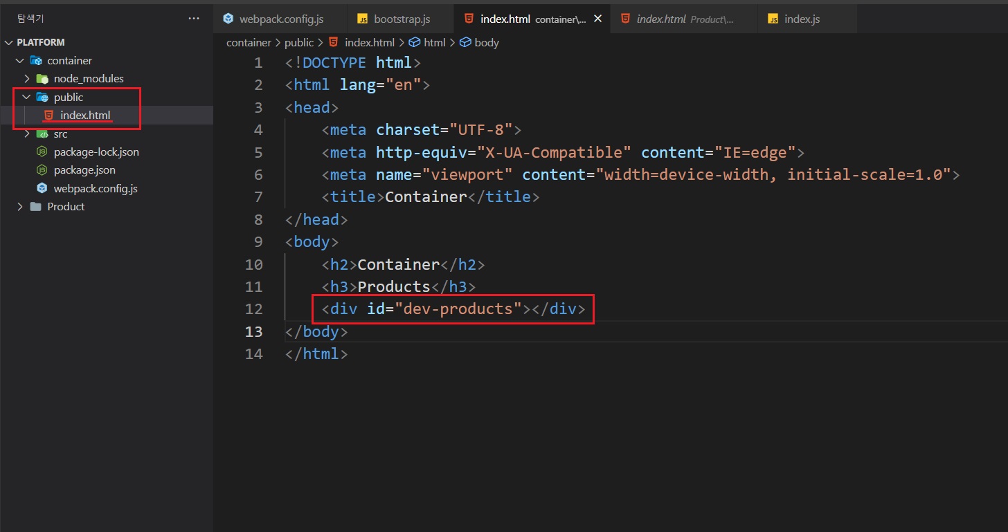 product의 index.js파일은 product 내의 'index.html'이 갖고 있는 id 요소가 지정되어 있기 때문이다. 이를 해결하려면, 아래와 같이 container의 index.html파일에 product의 id요소를 추가해야 한다.