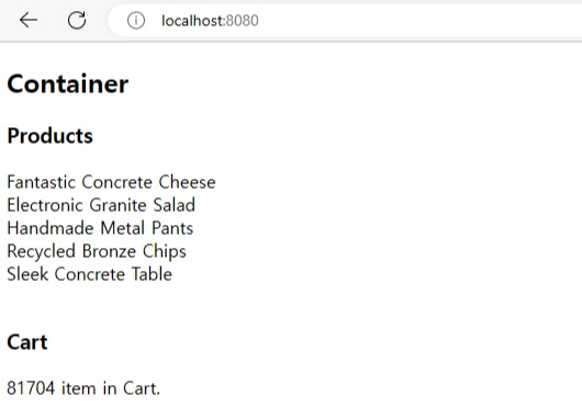 아래와 같이 product, cart의 "src/index.js" 모두 8080포트에서 확인할 수 있다.(container에서 병합)