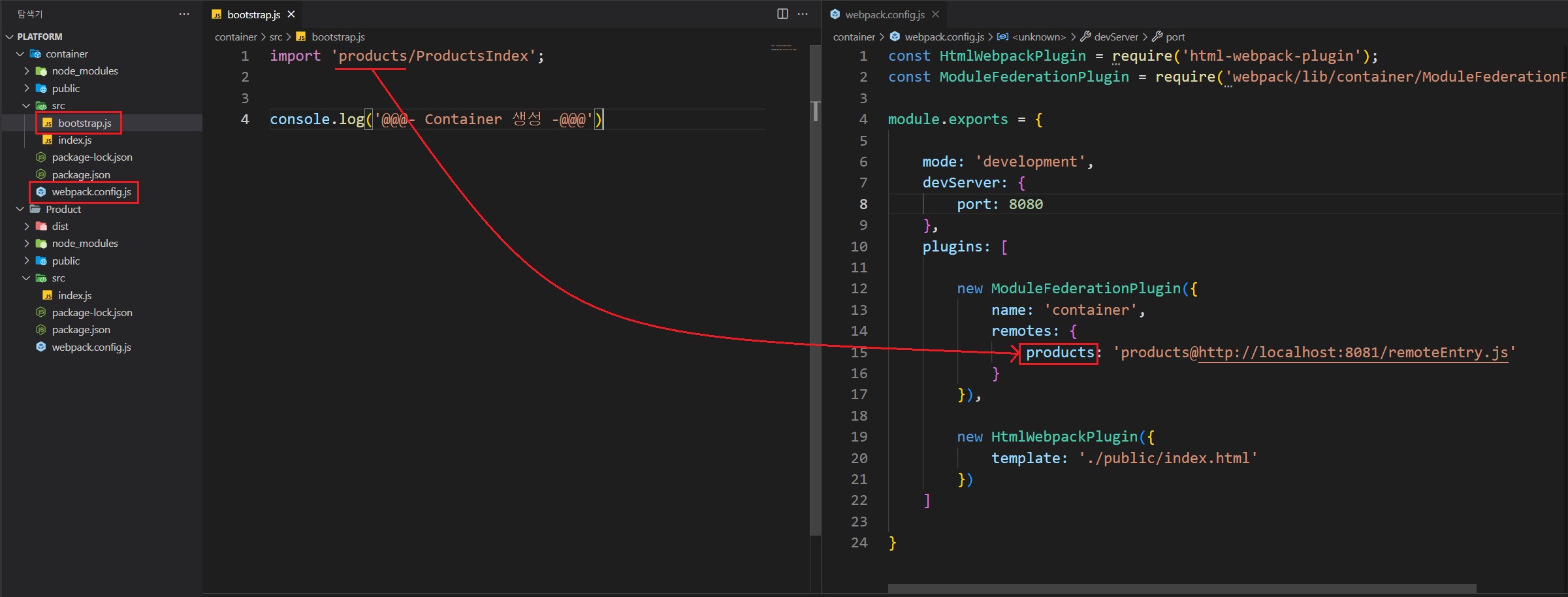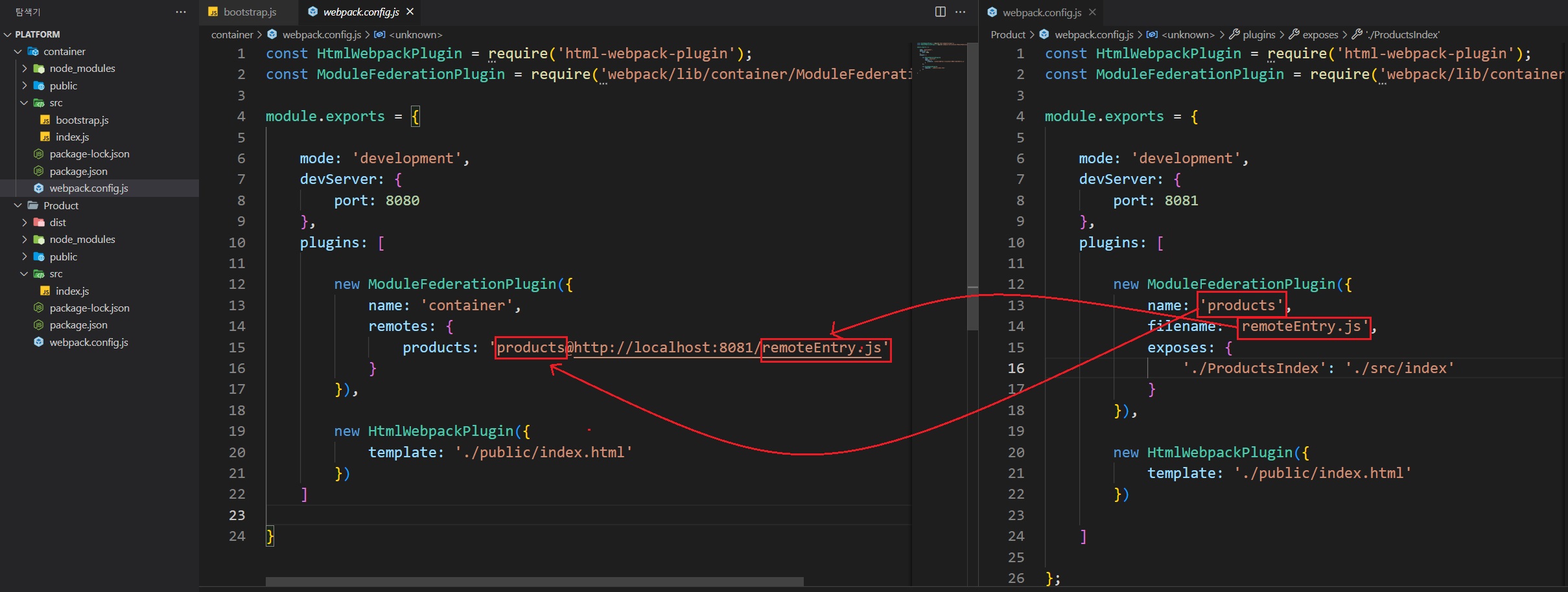 배포폴더(container)의 ModuleFederationPlugin(webpack.config.js)에는 remotes 객체값으로 하위 폴더 Federation플러그인 설정값(fetch주소, 이름, 임시 js파일)을 지정할 수 있다. 위에서는 product Federation플러그인에서 설정한 이름 'products'와 'filename'을 연결했다.