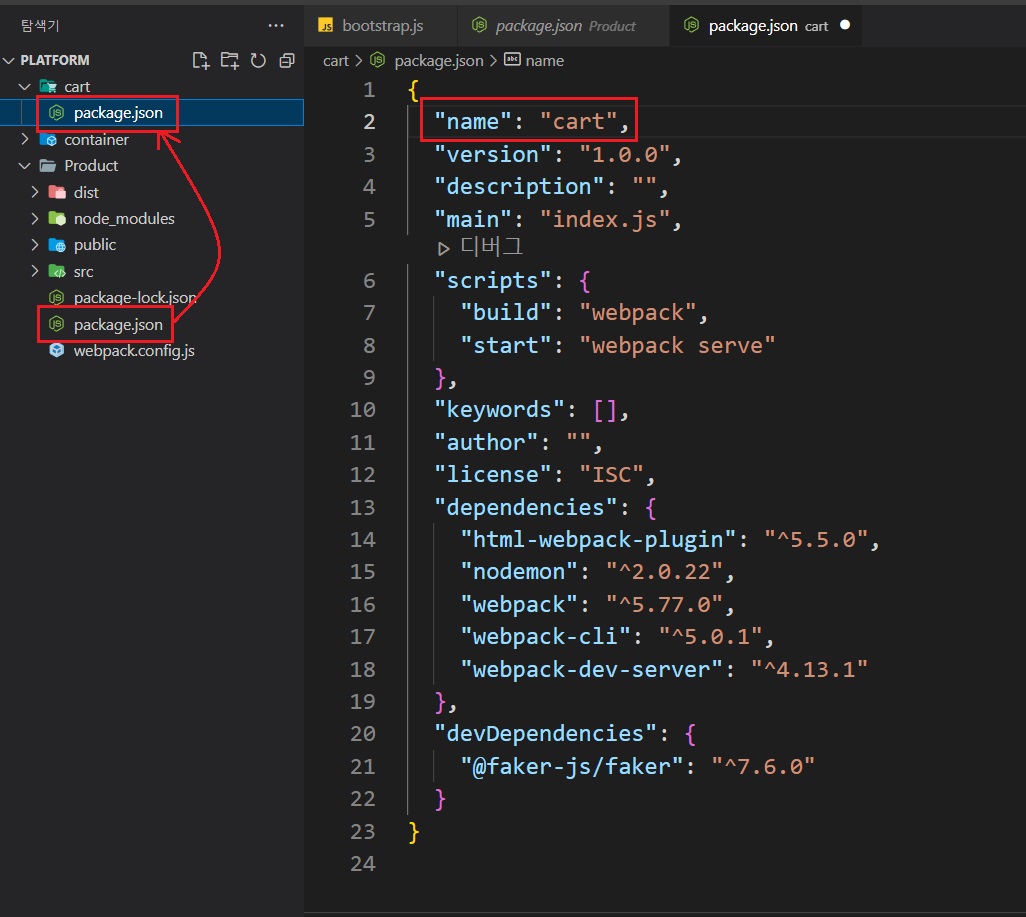 product의 package.json파일을 '복사-붙이기'로 넣어준다.(이름만 변경)