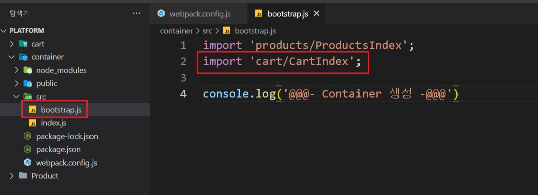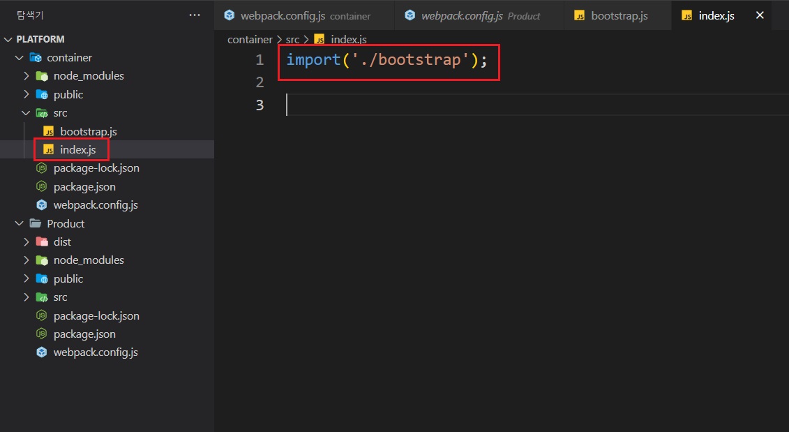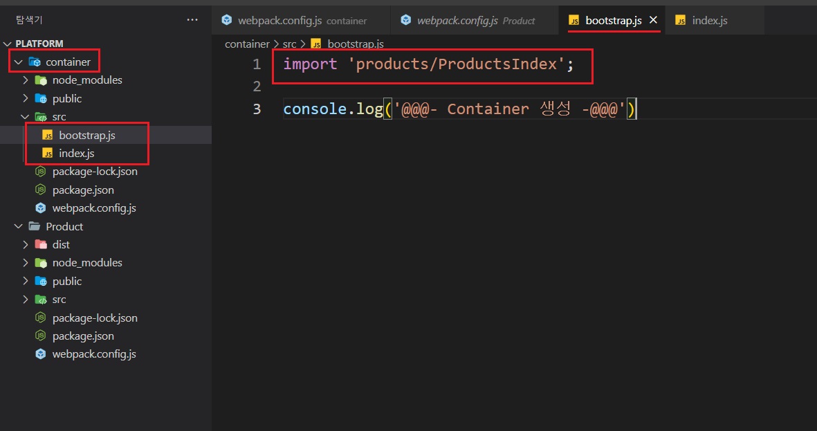 bootstrap.js에서 import하는 모듈은 'webpack.config.js'파일의 ModelFederationPlugin에서 설정한 'remotes' 값에 달려있다. import "[container]remotes객체의 key값/[product]exposes객체의 key값" 규칙이 적용된다.
