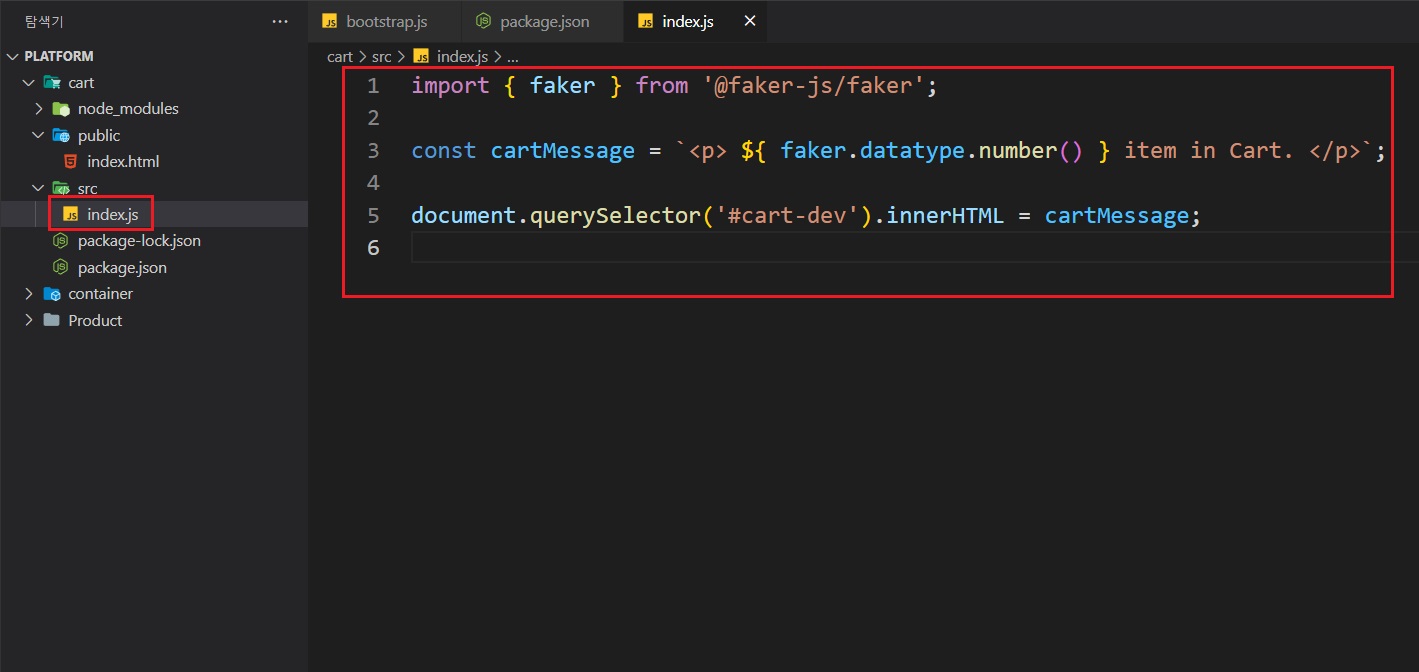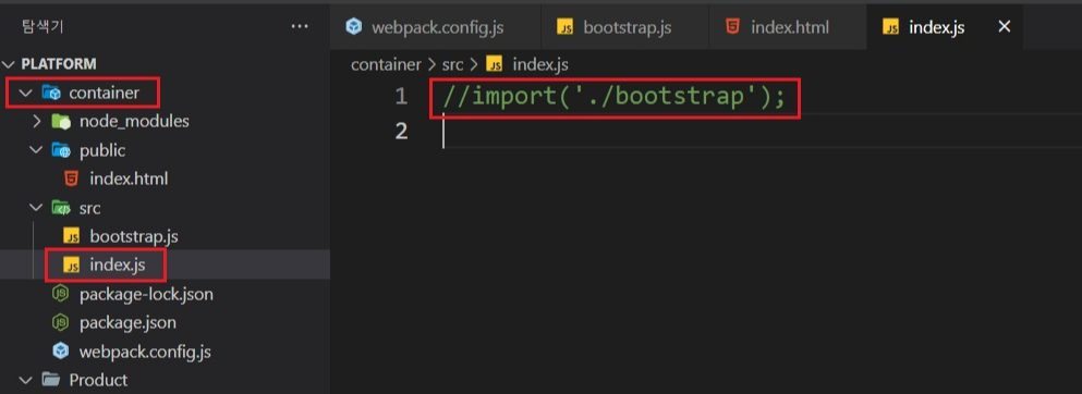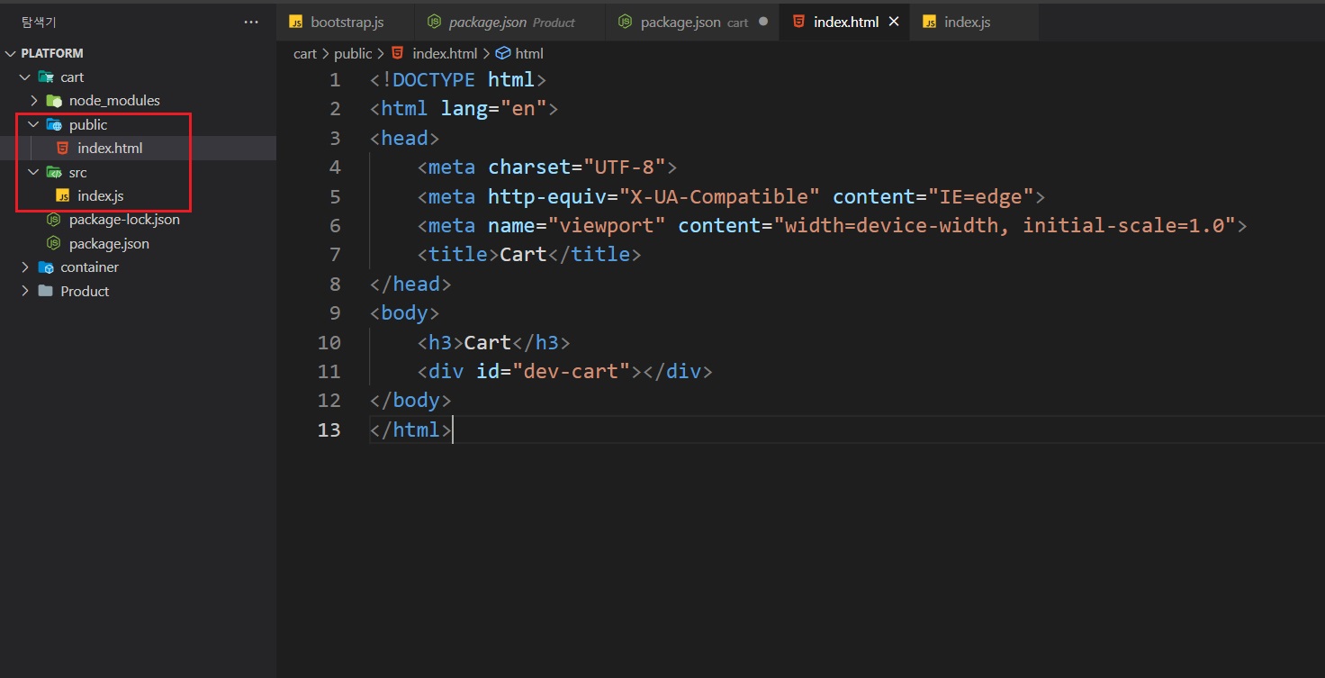 product폴더와 같은 방식으로 "public/index.html", "src/index.js", "src/bootstrap.js"를 생성한다.