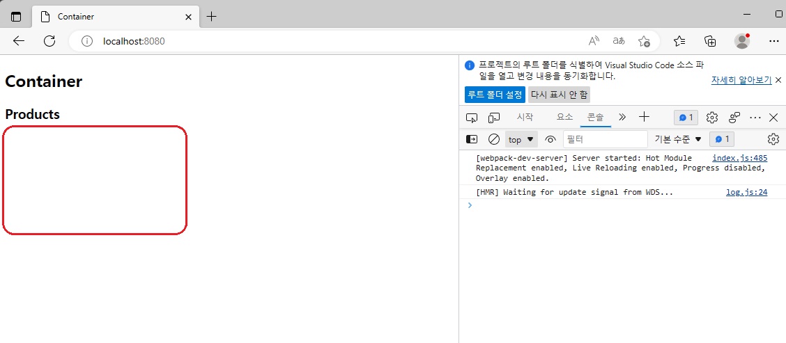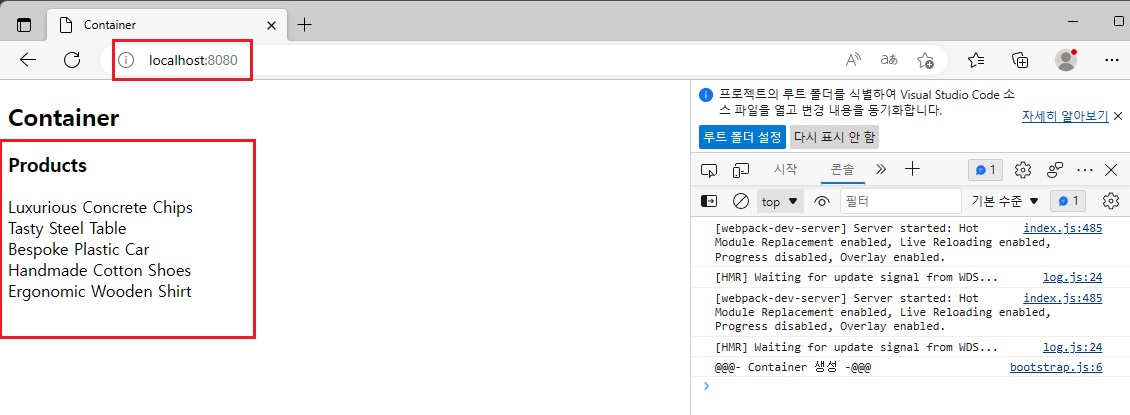 product, container 각 폴더에서 webpack 서버를 실행한 후, 포트8080으로 접속해보자.