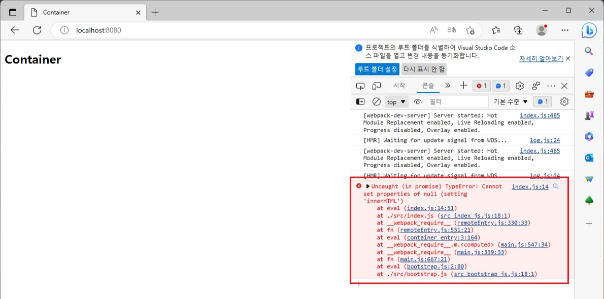 이 부분은 container의 webpack.config.js를 아래와 같이 수정함으로써 해결할 수 있다.