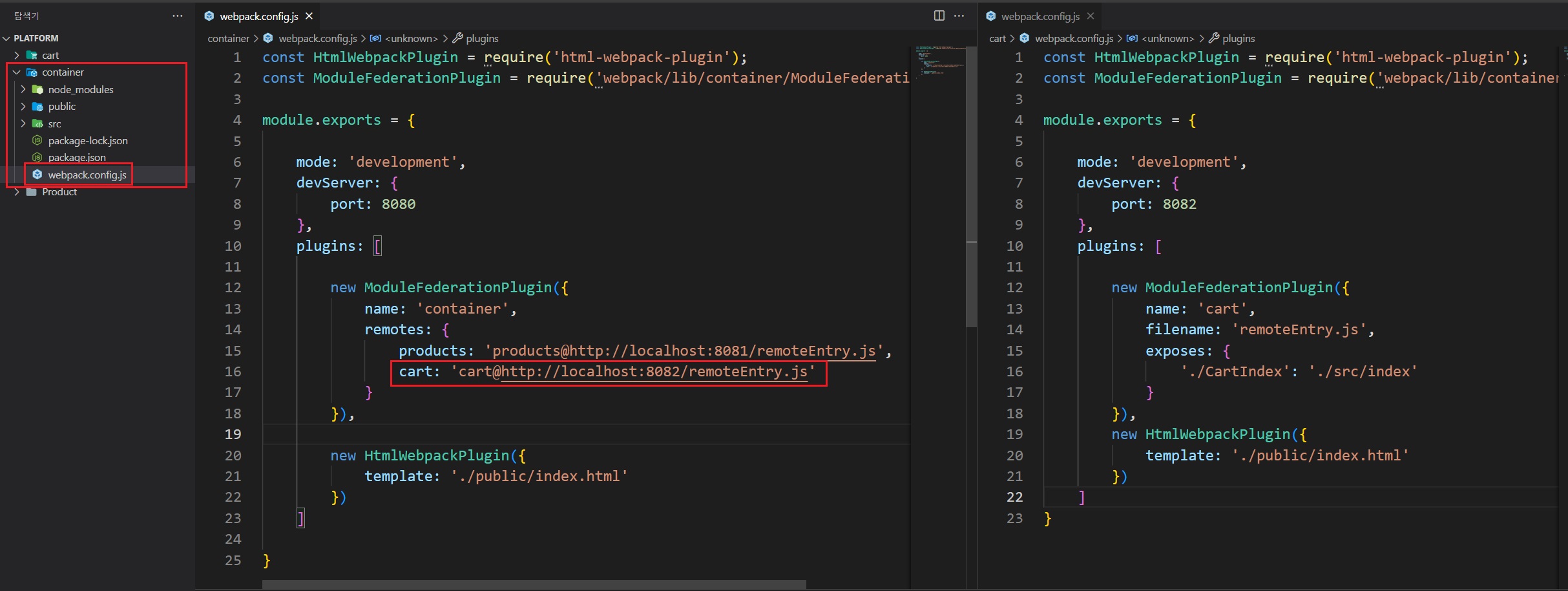반면, container폴더는 배포팀(팀장)이므로 하위 폴더를 조정 & 통제해야 한다. 그러므로 다음과 같이 ModuleFederationPlugin의 remotes값을 설정할 수 있다.