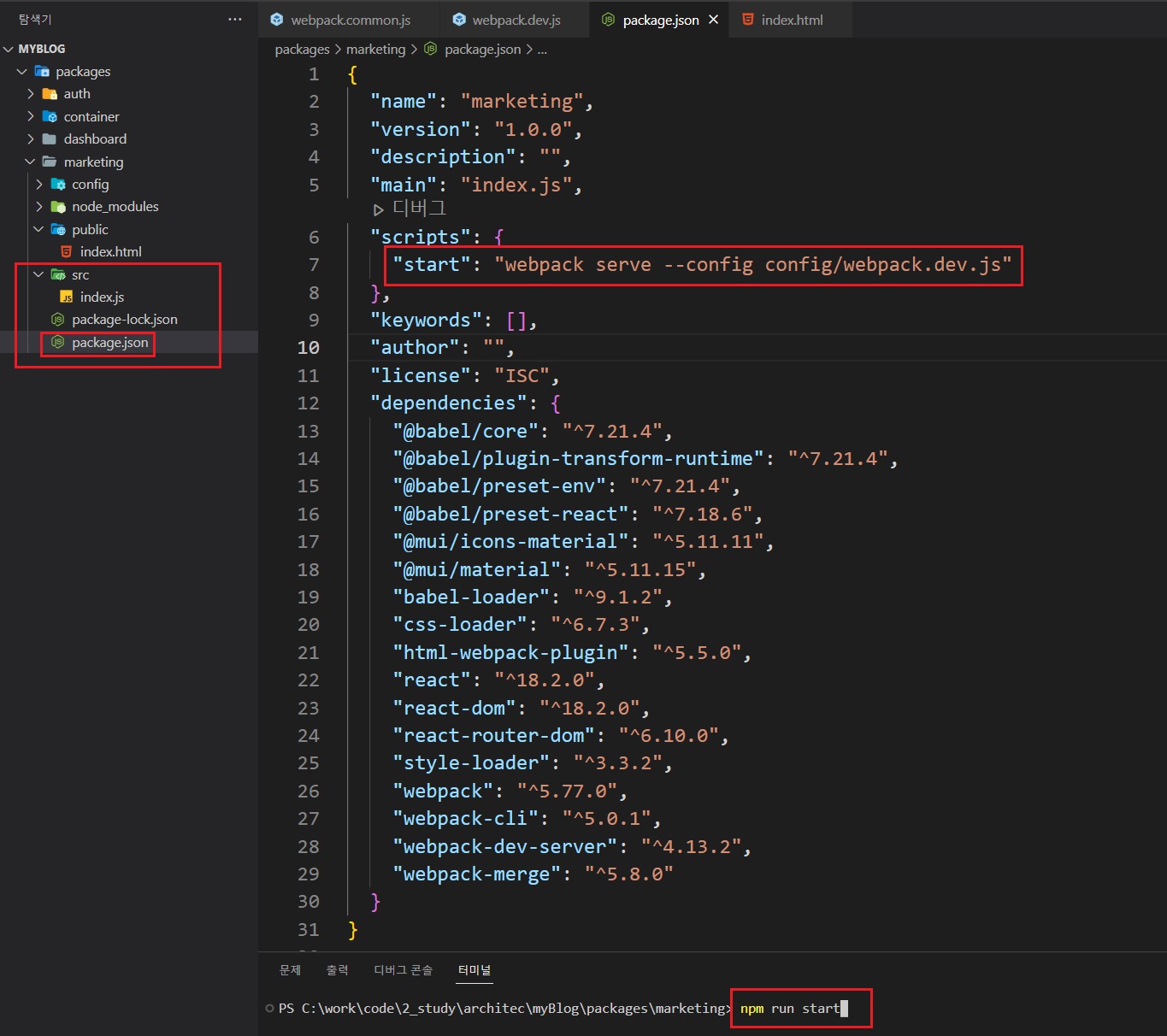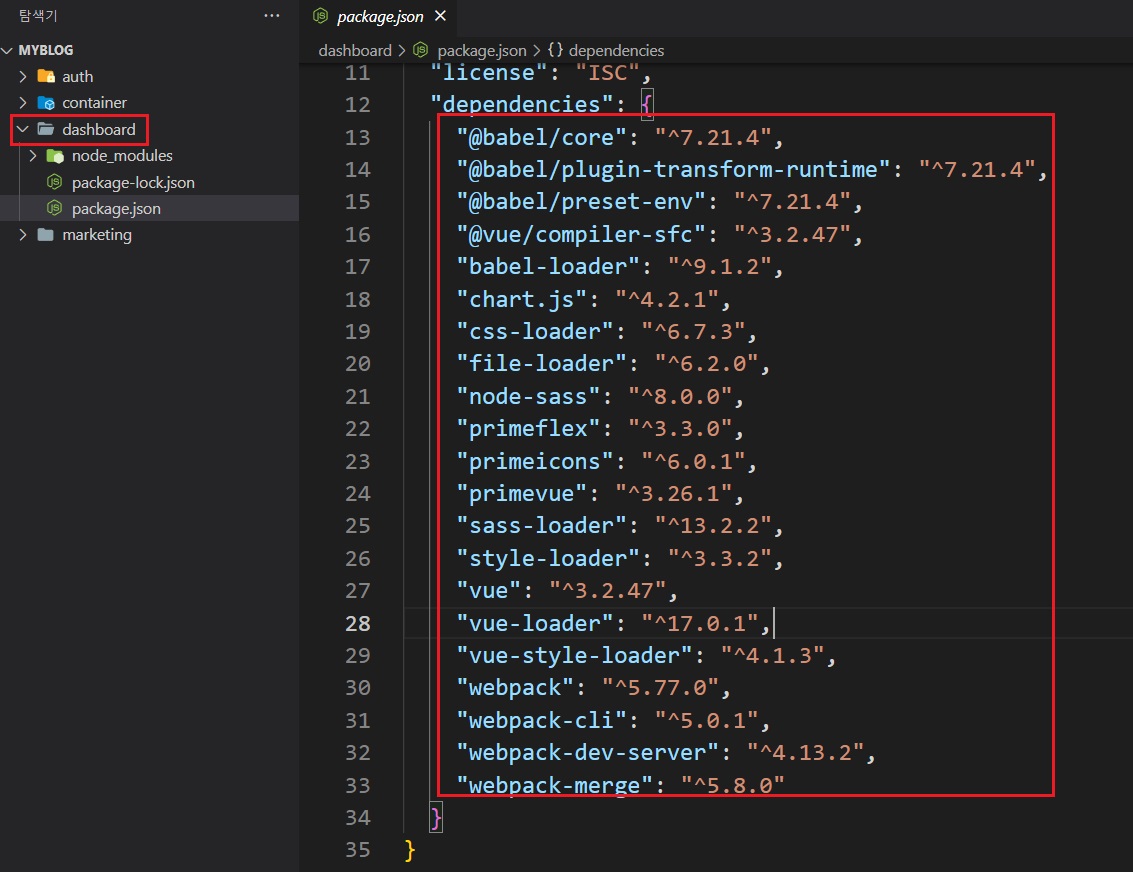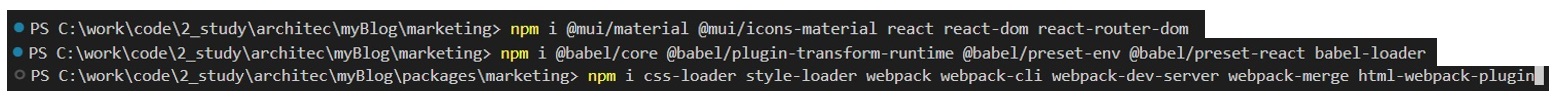 각 패키지별로 필요한 모듈이 다르지만 기본적으로 '웹팩, 바벨'은 공통이다. 현 프로젝트는 auth, container, marketing패키지는 같은 모듈을 설치하며, dashboard는 chart.js와 같은 독자적인 모듈을 몇개 더 설치하는 구성이다.
