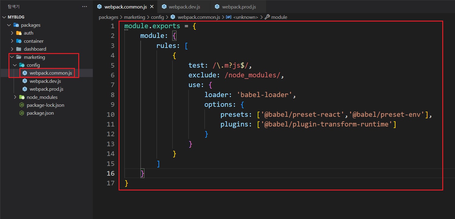 config폴더를 생성한 뒤, 'webpack.common.js(공통)', 'webpack.dev.js(개발 테스트용)', 'webpack.prod.js(배포용)' 3개의 파일을 생성한다. 'webpack.common.js'파일에는 아래와 같이 각 패키지에서 공통으로 사용되는 규칙을 넣어준다.