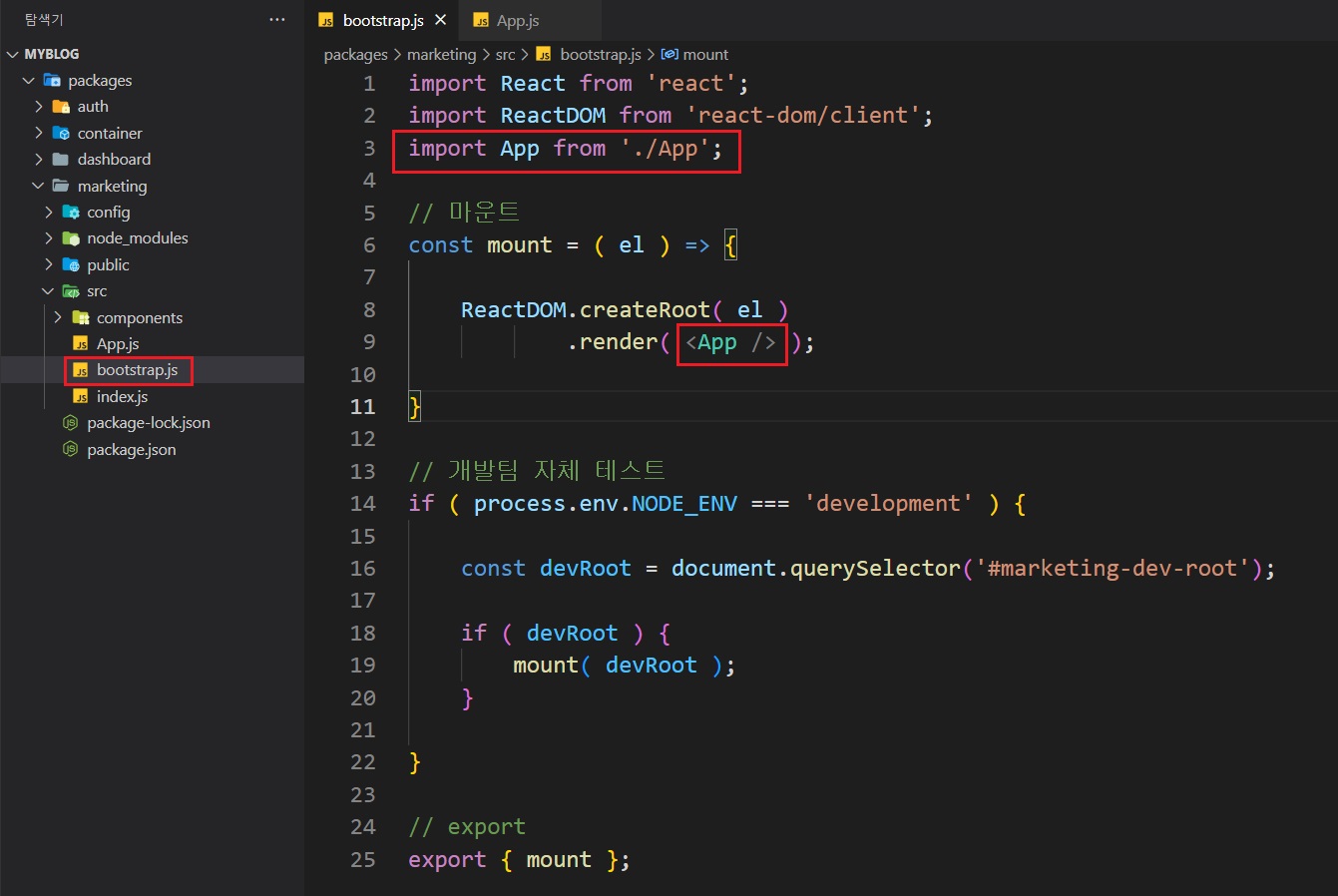 index.js는 bootstrap.js를 모듈로 가져오며(앞 포스팅 참고), bootstrap.js가 실질적인 기능을 담당한다.(mount함수)