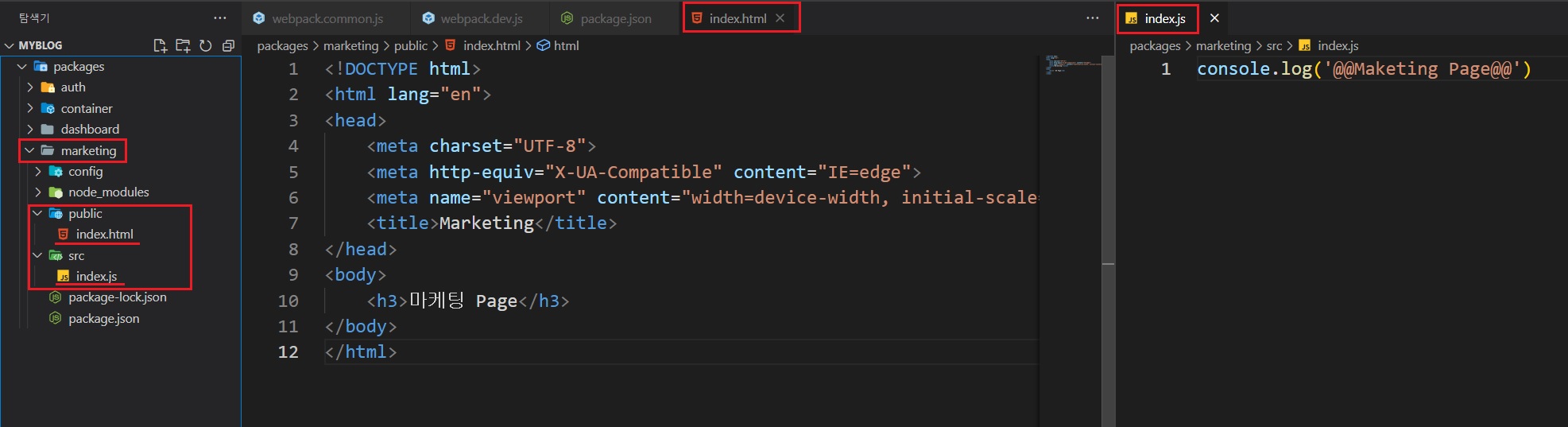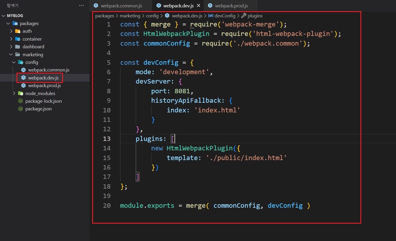 webpack.dev.js는 각 패키지 개발팀에서 테스트 목적(자체 빌드)으로 사용한다. 가령, marketing패키지의 경우, 아래와 같이 '포트', '플러그인'을 설정한 뒤 webpack.common파일과 결합한 모듈을 export 한다.
