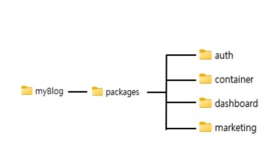 프로젝트(myBlog) 하위 구조로써 각 패키지들이 존재하며(auth, container, dashboard, marketing) 각 패키지들은 독립적으로 빌드가 가능하다.