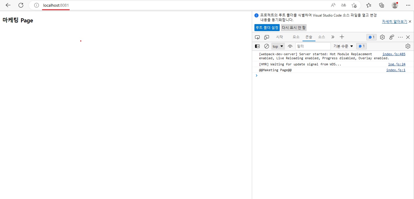 위의 코드까지 실행한 후, marketing패키지(폴더)를 웹팩으로 실행해보면 리액트가 적용된 화면을 볼 수 있다.