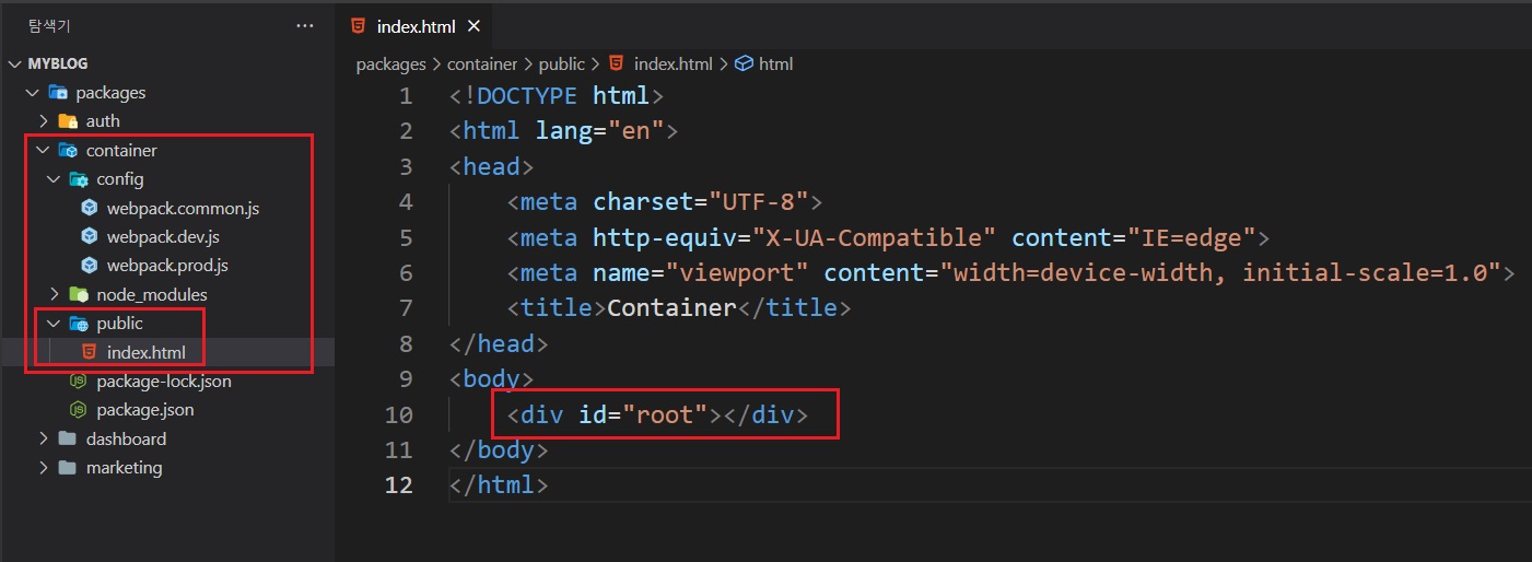 container 역시 리액트를 사용할 예정이므로 'root' ID를 index.html에 추가한다.