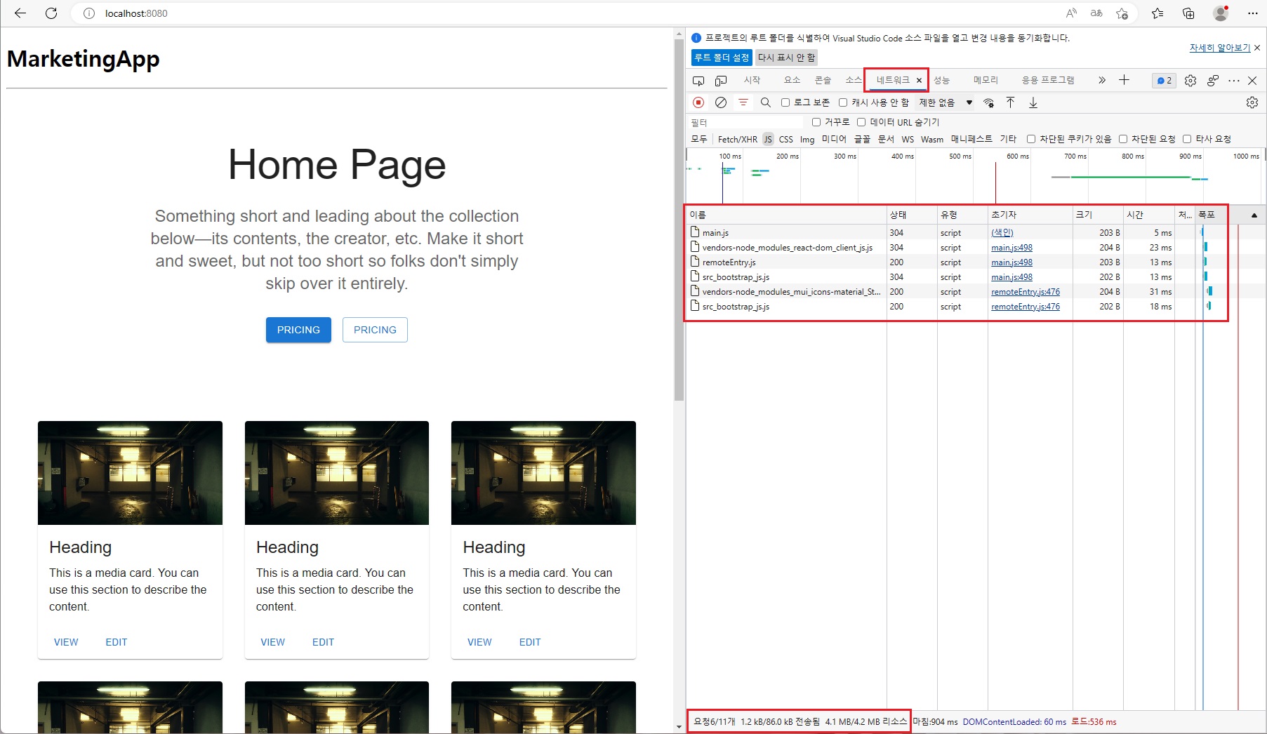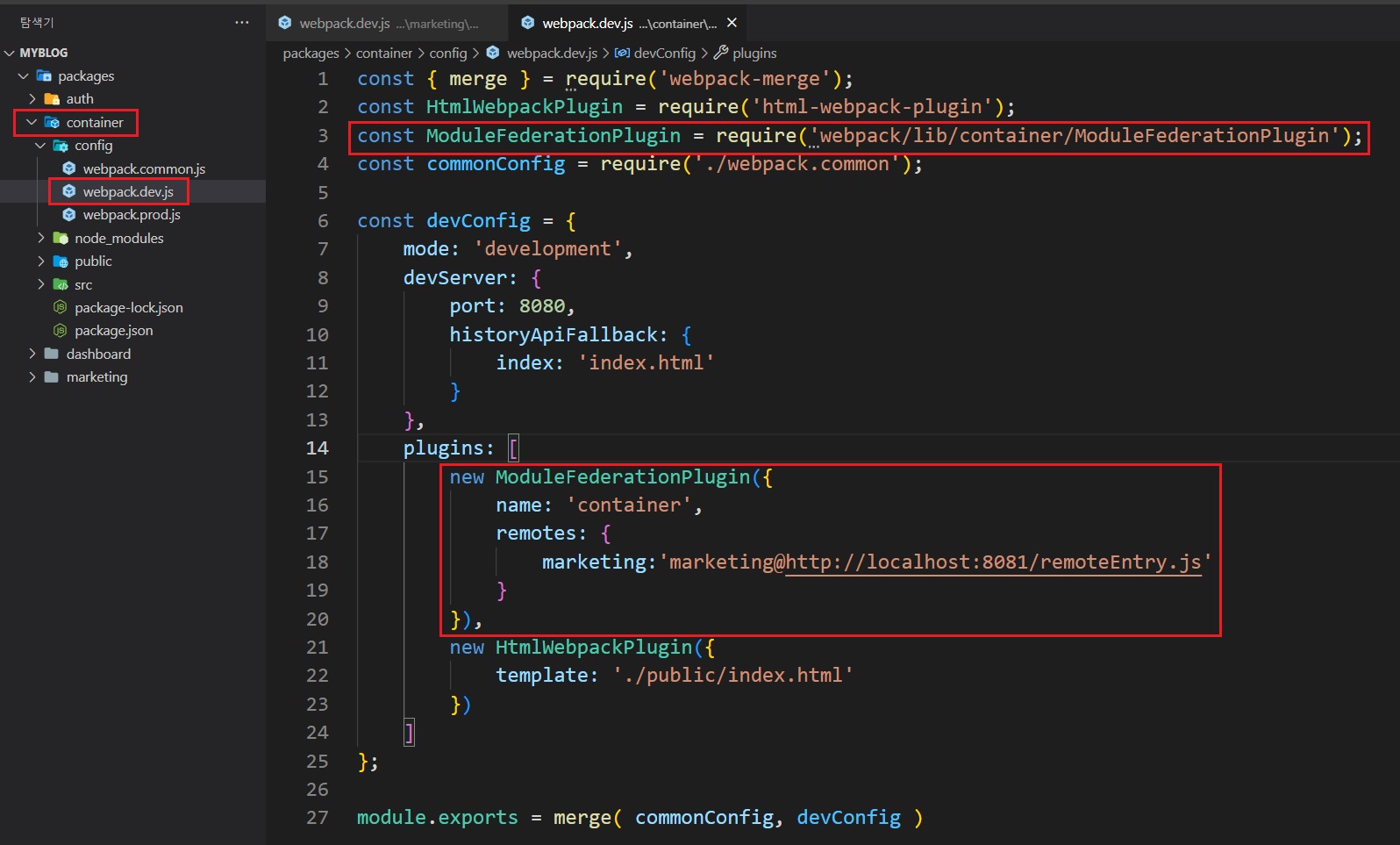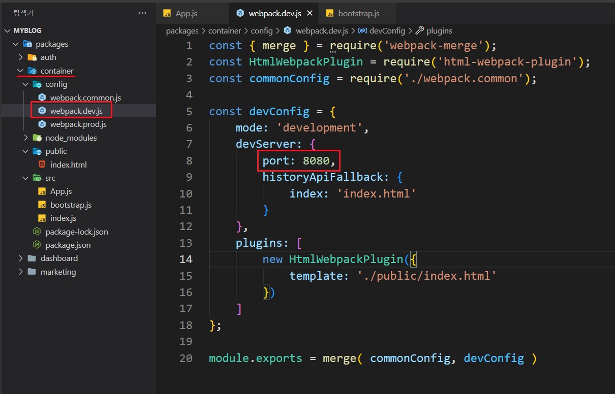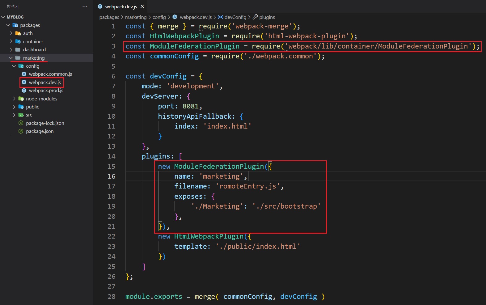 위의 설정을 통해 marketing의 webpack.dev.js는 'ModuleFederationPlugin'모듈을 받아 실행파일(bootstrap.js)을 localhost:8081/remoteEntry.js 경로로 내보낸다.